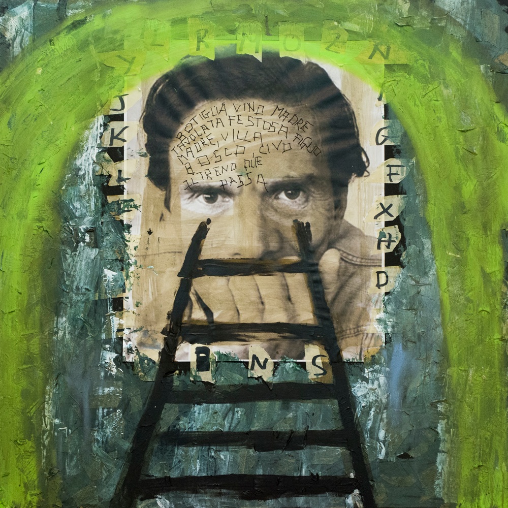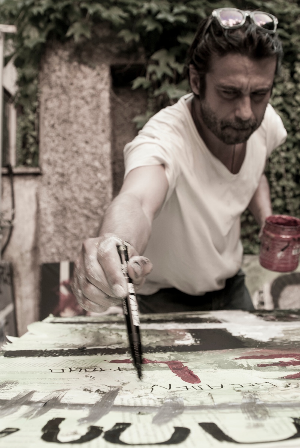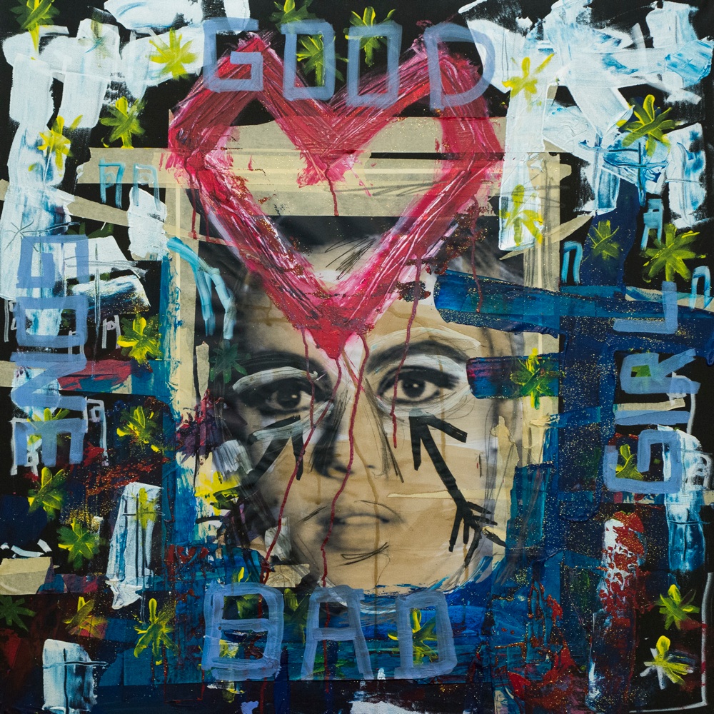 Così è iniziata la collaborazione con Campomarzio70, brand italiano che distribuisce una selezione ragionata di “profumi artistici” – i piccoli e indipendenti, che seguono criteri autonomi, poetici a volte, lontani dai macro trend di mercato. Risultato: Inspiring Paintings – Perfumes on Canvas, 14 opere dai colori accesi e dal tratto vigoroso. Mito, ad esempio, si ispira all’omonima fragranza di Vero.Profumo: un mix di fiori bianchi e note acquatiche, che rimandano a un banchetto a Villa D’Este a Tivoli, a un personaggio androgino, tra maschile e femminile. La resa pittorica? Il volto di Pier Paolo Pasolini, coperto in parte da scritte e circondato da pittura verde, densa e boschiva. Oppure Good Girl Gone Bad, che traspone un’essenza di By Kilian (a base di fiori carnali come gelsomino e tuberosa) – un volto femminile che emerge dalla nebbia, occhi che catturano l’attenzione, un grande cuore rosso a rappresentare passione e sensualità.