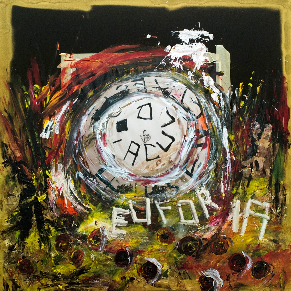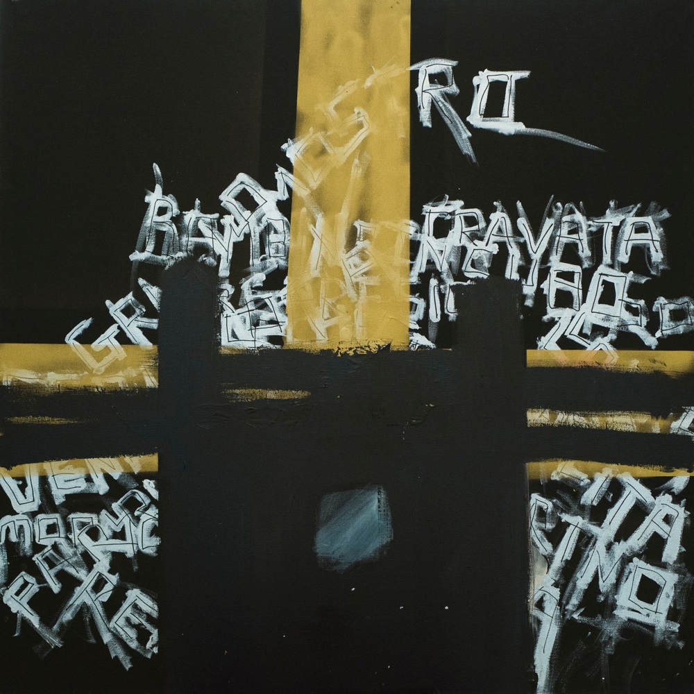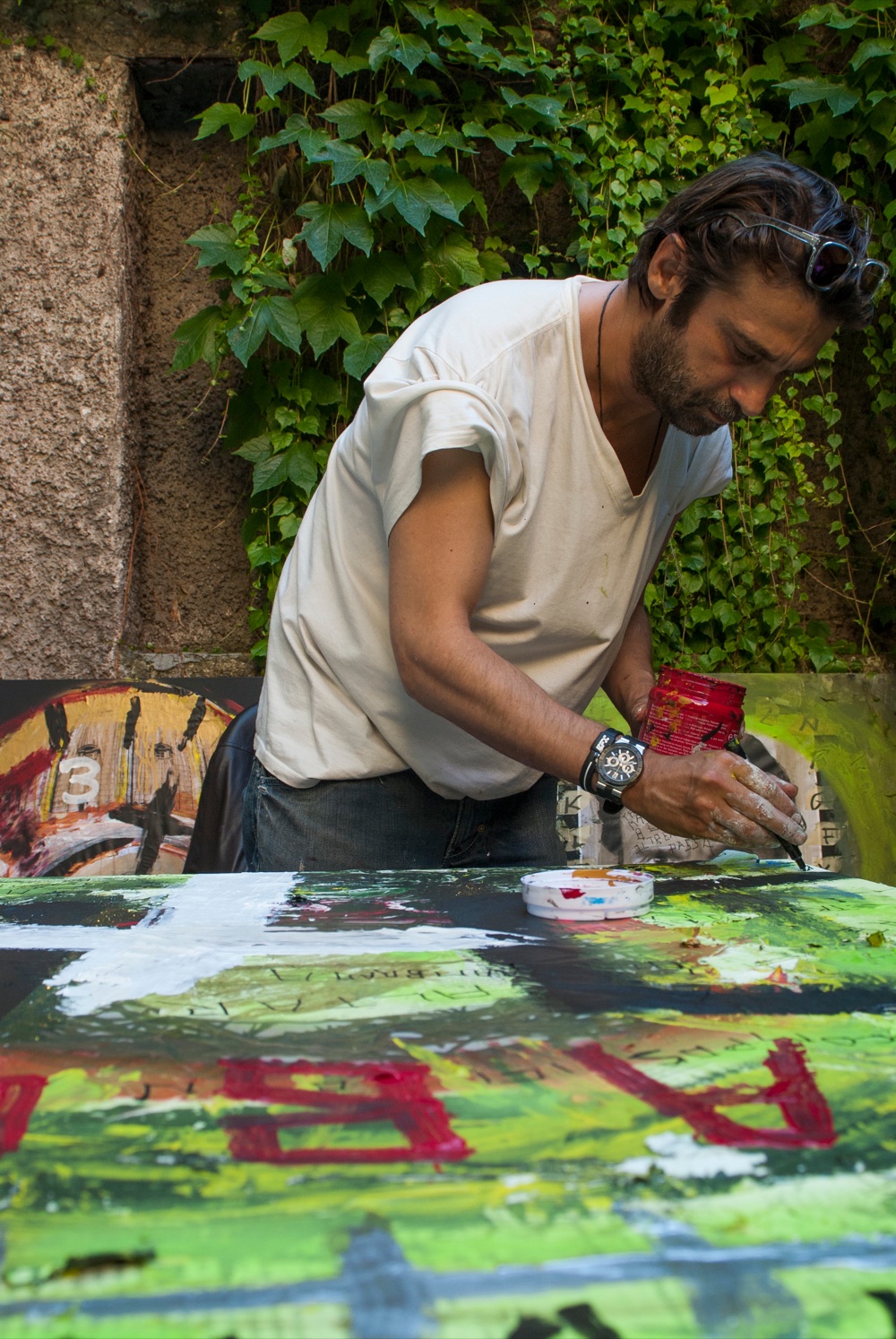 Così è iniziata la collaborazione con Campomarzio70, brand italiano che distribuisce una selezione ragionata di “profumi artistici” – i piccoli e indipendenti, che seguono criteri autonomi, poetici a volte, lontani dai macro trend di mercato. Risultato: Inspiring Paintings – Perfumes on Canvas, 14 opere dai colori accesi e dal tratto vigoroso. Mito, ad esempio, si ispira all’omonima fragranza di Vero.Profumo: un mix di fiori bianchi e note acquatiche, che rimandano a un banchetto a Villa D’Este a Tivoli, a un personaggio androgino, tra maschile e femminile. La resa pittorica? Il volto di Pier Paolo Pasolini, coperto in parte da scritte e circondato da pittura verde, densa e boschiva. Oppure Good Girl Gone Bad, che traspone un’essenza di By Kilian (a base di fiori carnali come gelsomino e tuberosa) – un volto femminile che emerge dalla nebbia, occhi che catturano l’attenzione, un grande cuore rosso a rappresentare passione e sensualità.