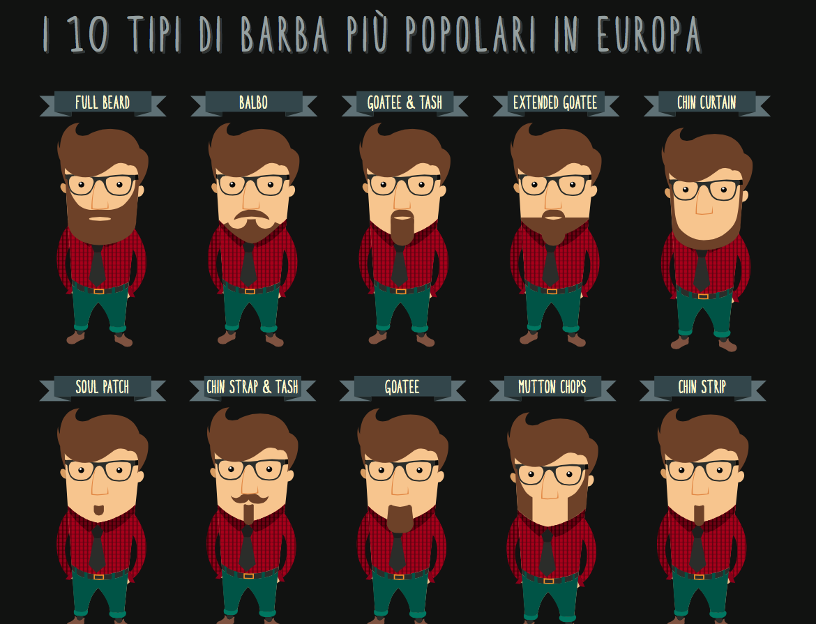 I tre stili più amati. Il sondaggio rivela anche gli stili di barba e baffi più amati. Tra tutti spicca lo stile “Full-beard” (la classica barba folta), reso popolare da alcune star di Hollywood come Jake Gyllenhaal e Ryan Gosling, attualmente di gran moda e scelto dal 40% di “barbuti” europei. Il “Balbo style” (guance pulite di modo che la barba non si unisca alle basette) famoso grazie al personaggio di Tony Stark in Iron Man interpretato da Robert Downey Junior, è il secondo stile più diffuso. Chiude il podio degli stili più popolari, il “Goatee with moustache” (pizzo unito ai baffi) come quello di Walter White in Breaking Bad.