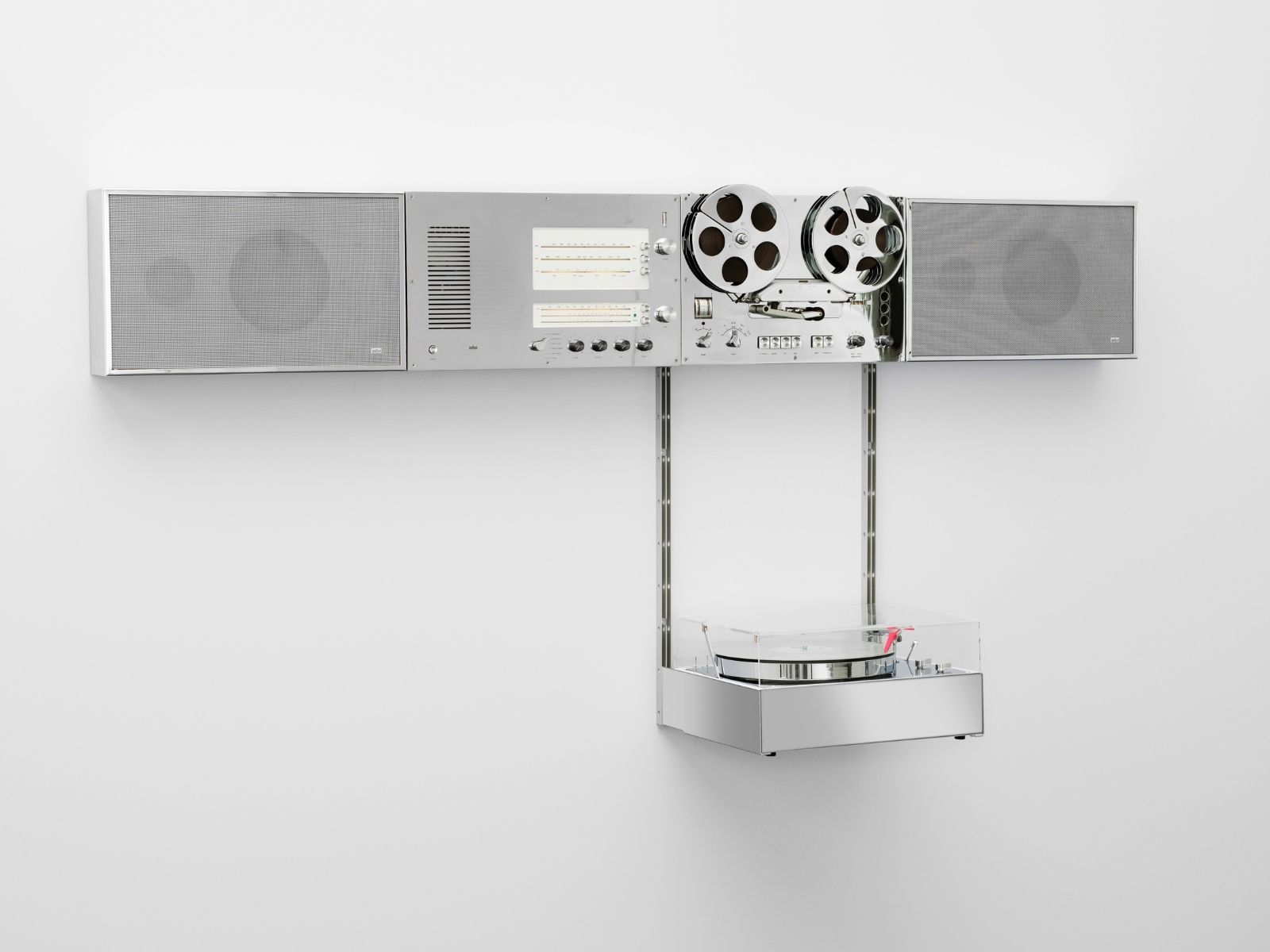 La collaborazione con Virgil Abloh vede il designer immergersi negli archivi di Braun per rimodernare e co-curare, insieme al team design del brand, l’impianto stereo a parete hi fi “Wandanlage” del 1965, per trasformarlo in un’opera “d’arte funzionale”. Il rivestimento metallico della versione del 2021 è una manifestazione visiva dei parallelismi tra l’estetica del design cromo lucido di Braun – come il rasoio SM3 del 1960 e il tostapane T1 del 1961 – e il lustro degli spunti culturali e musicali degli ultimi 100 anni di Virgil Abloh.