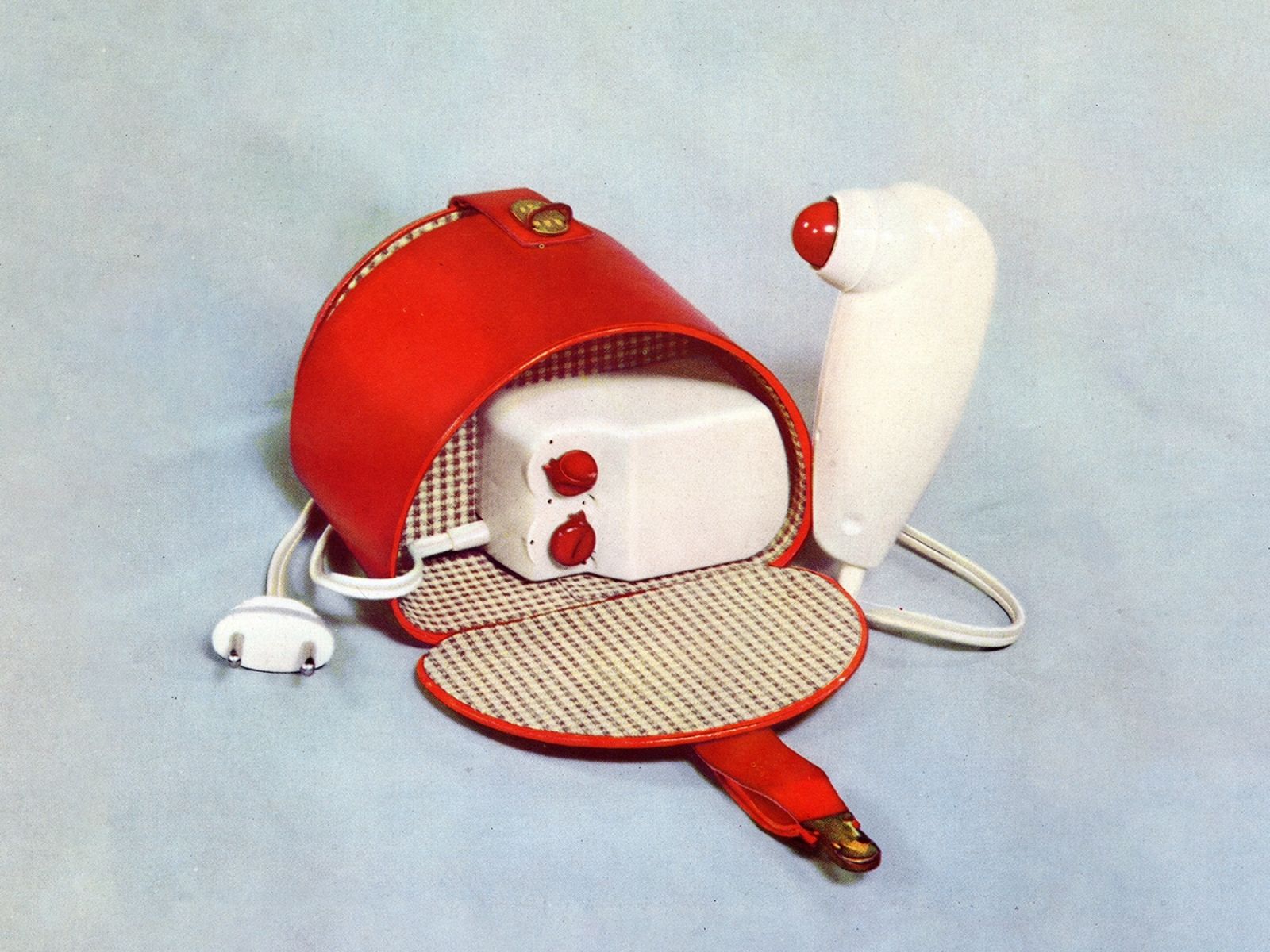 L’impugnatura inclinata di questo asciugacapelli era una forma completamente nuova all’epoca, nata da considerazioni ergonomiche: l’impugnatura angolata consentiva un uso più confortevole rispetto all’impugnatura ad angolo retto più convenzionale.
