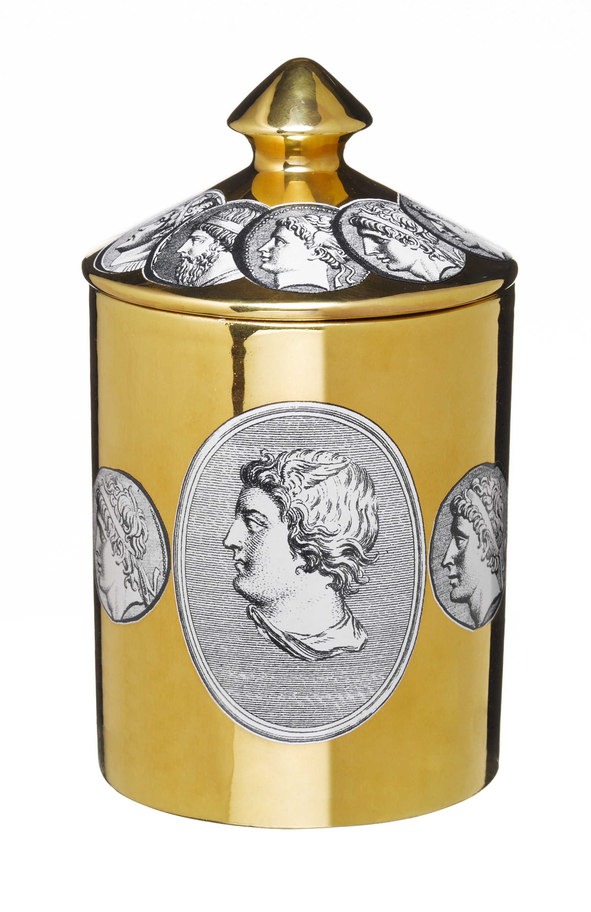 La bougie di Fornasetti è contenuta in un vaso con coperchio color oro, è stata creata dal naso Olivier Polge e profuma di timo, incenso e labdano.
