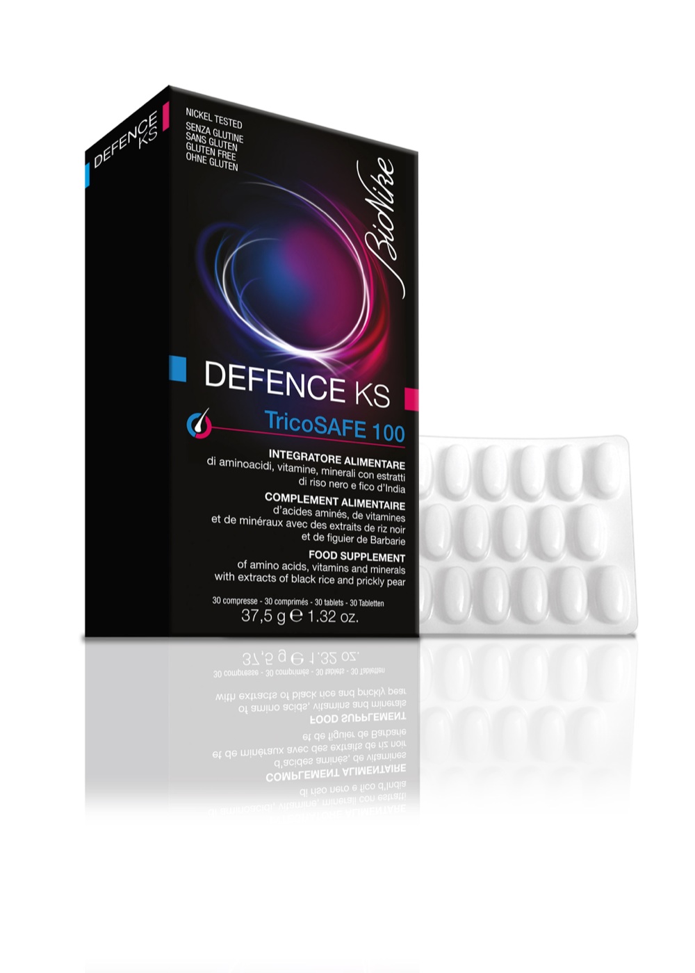 La linea Defence KS di Bionike è composta da tre elementi in due step: l’integratore in pastiglie, una lozione anticaduta e lo shampoo specifico