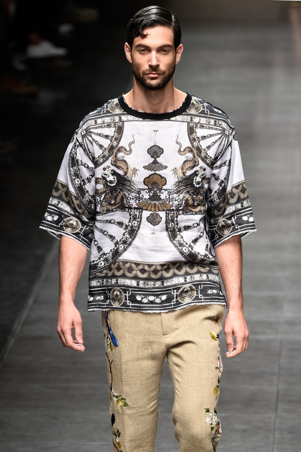 Gli anni Cinquanta. È inutile, a Dolce & Gabbana l’uomo italiano degli anni Cinquanta piace sempre. Riga di lato ben definita, capello impomatato lucido e leggero ciuffo sulla fronte. L’unica accortezza è nella scelta della pomata-gel: deve essere estremamente strong.