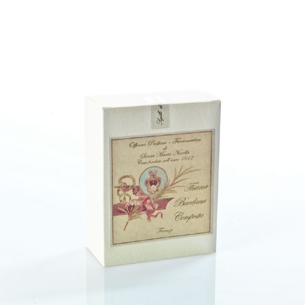 La tisana Bardana Composta di Officina Santa Maria Novella può essere bevuta fino a 3 volte al giorno e contiene tiglio e cicoria.