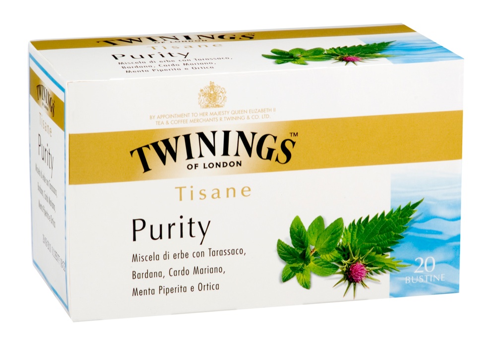 Beneficia delle proprietà benefiche di alcune piante, la menta piperita per alleviare emicranie o il cardo mariano dalle proprietà antiossidanti la tisana Purity di Twinings.