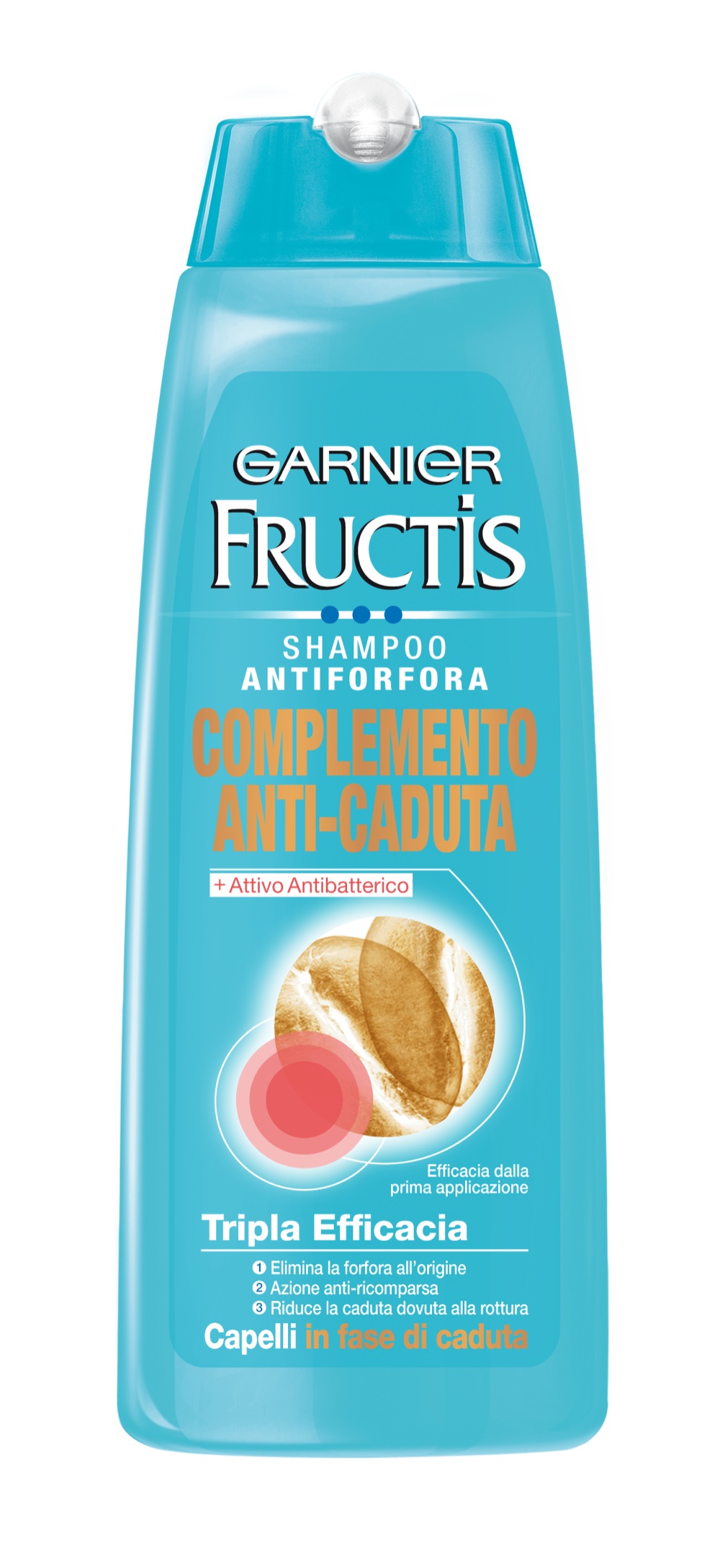 Ricco di acidi di frutta e di vitamina B3, lo Shampoo Antiforfora Complemento Anti-caduta di Fructis riequilibra la cute
