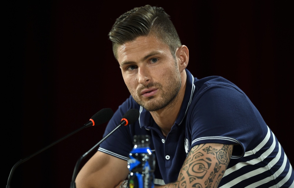 France’s forward Olivier Giroud addresses a press conference at the theater in Ribeirao Prato on June 10, 2014, prior to the start of the 2014 FIFA World Cup in Brazil. AFP PHOTO / FRANCK FIFE