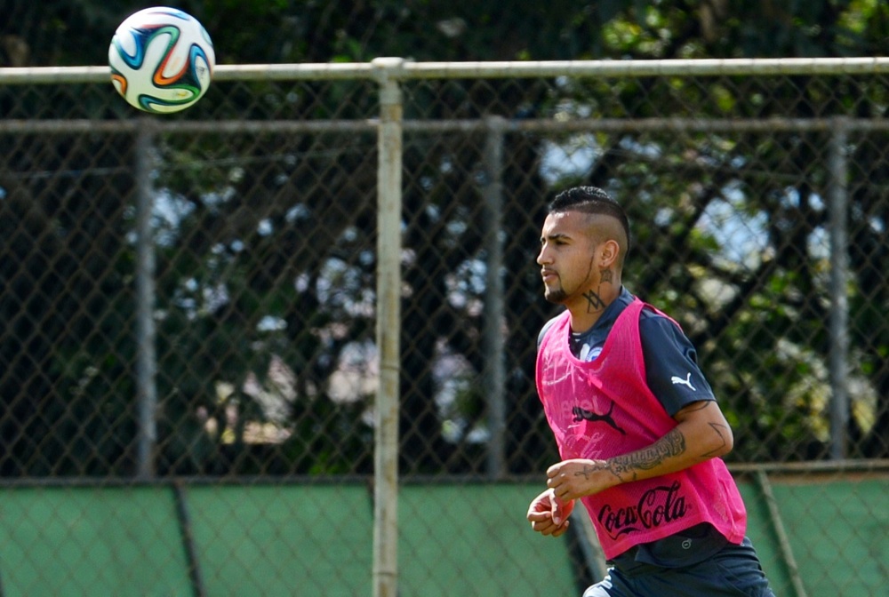 Chile’s national football team midfielder Arturo Vidal runs for the ball during a training session at the Toca da Raposa training ground in Belo Horizonte, on June 11, 2014, ahead of the 2014 FIFA World Cup in Brazil. AFP PHOTO/MARTIN BERNETTI