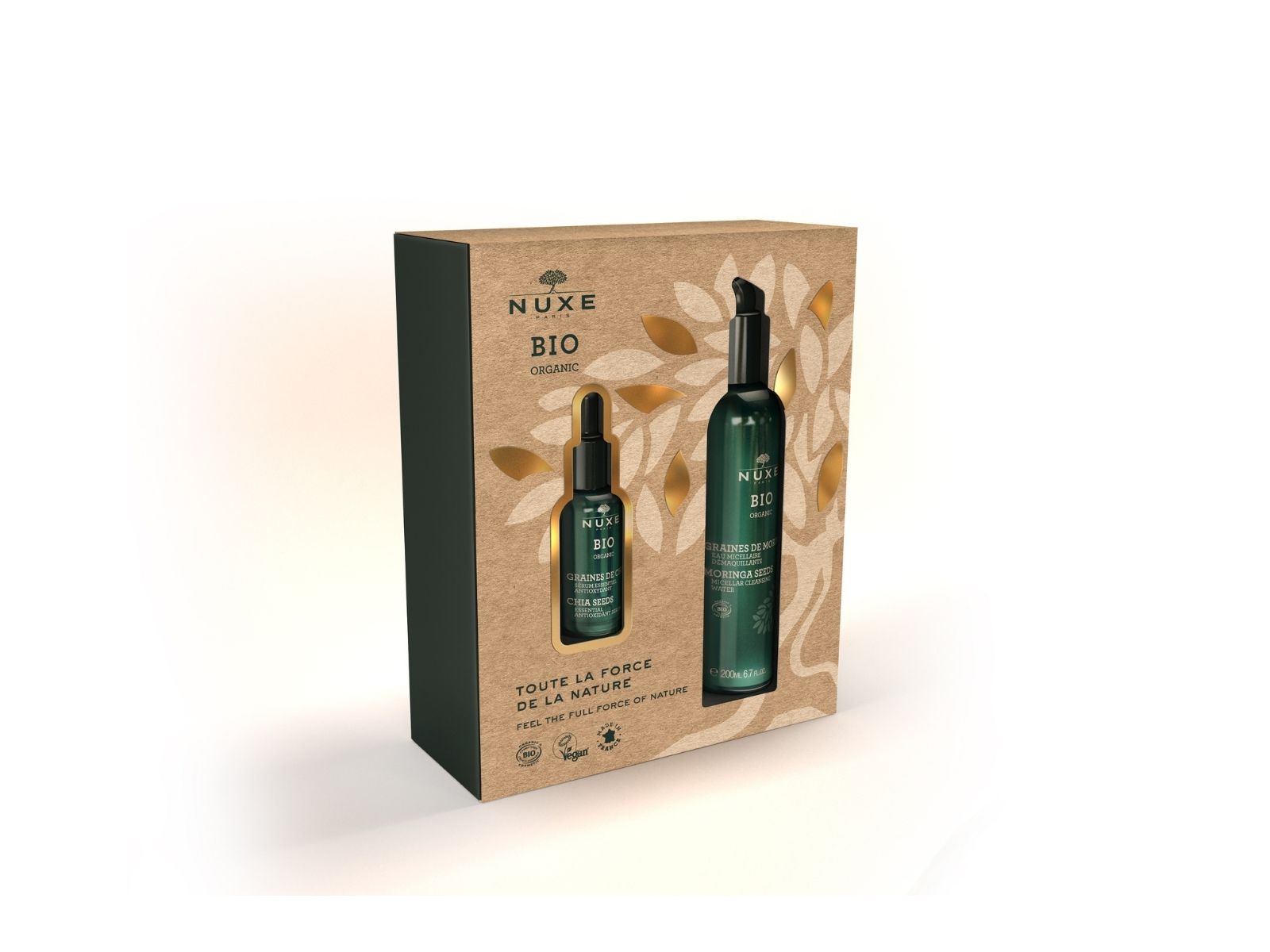 Dedicata alla nuovissima linea Bio, Nuxe ha pensato all’omonimo cofanetto con all’interno il siero viso e l’acqua micellare