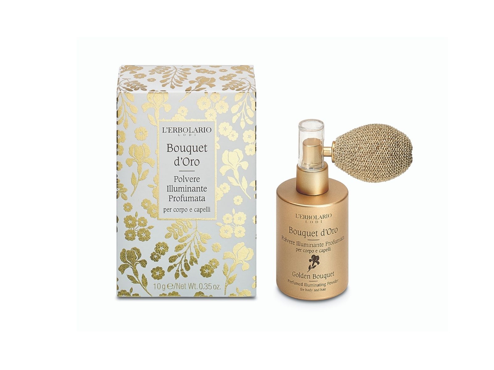 Bouquet d’Oro è una delle collezioni natalizie, assieme a Bouqet d’Argento, de L’Erbolario. Nella collezione anche la Polvere Illuminante Profumata che si spruzza su corpo e capelli con lo spruzzino d’antan all’aroma di giaggiolo, primula e miele