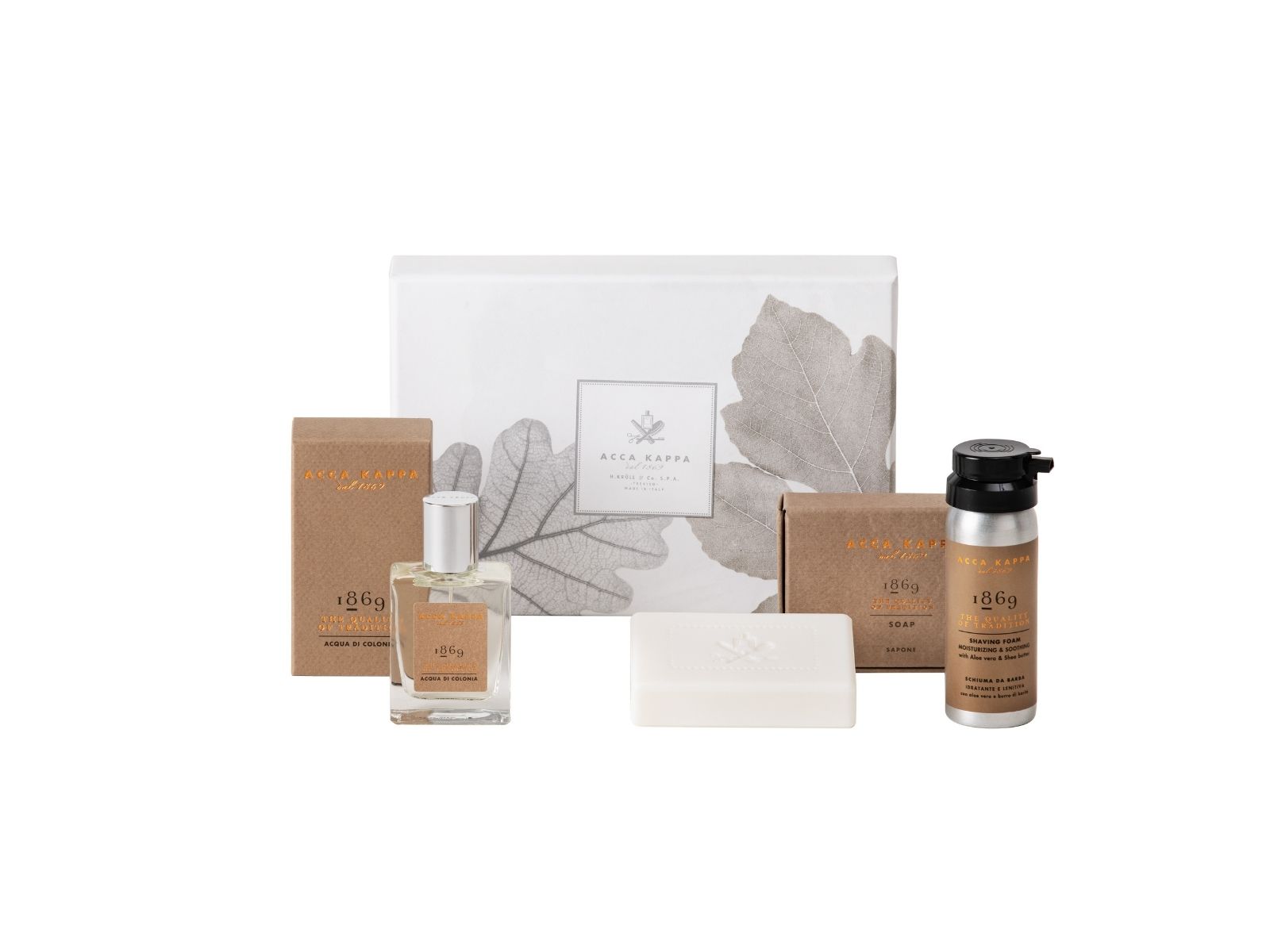 1869 è il coffrett di Acca Kappa dedicato alla sua linea maschile e comprende l’acqua di colonia, il sapone solido e la shaving foam idratante