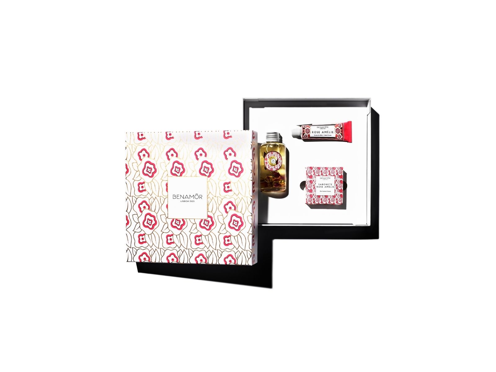 Il Rose Amélie Gift Set di Benamôr è una linea pensata per la Regina Amelie di Portogallo e comprende l’olio secco per corpo, viso e capelli, la crema mani e il sapone solido emolliente