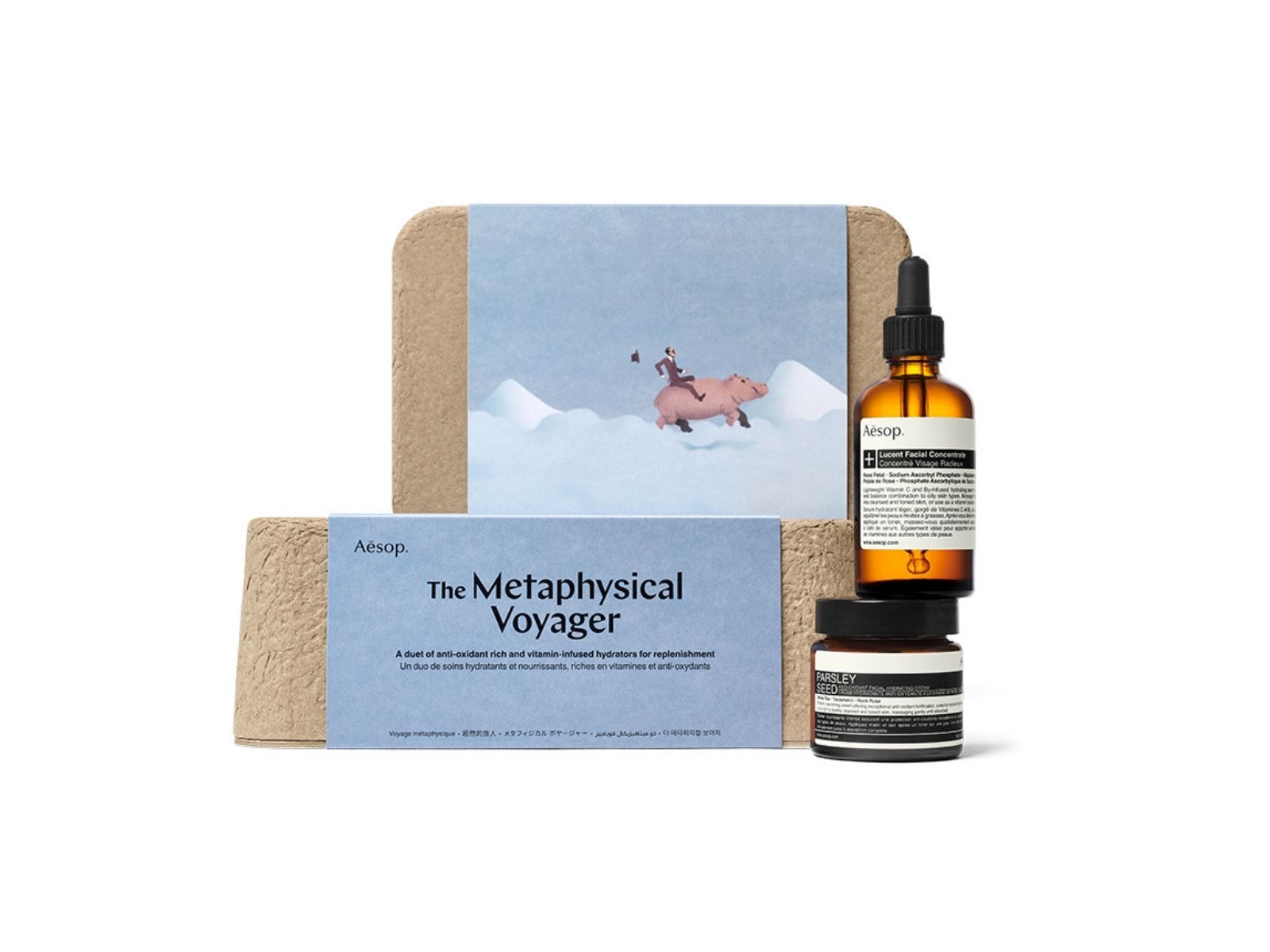 The Metaphysical Voyager di Aēsop è un duo di idratanti per il viso, ideali in inverno. All’interno del pack infatti sono presenti il Lucent Facial Concentrate e la Parsley Seed Anti-Oxidant Facial Hydrating Cream