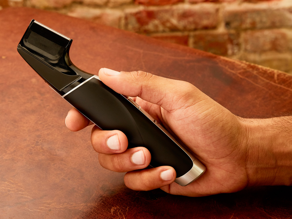L’impugnatura ergonomica richiama quella del rasoio del barbiere, permette controllo e precisione impeccabili anche a casa