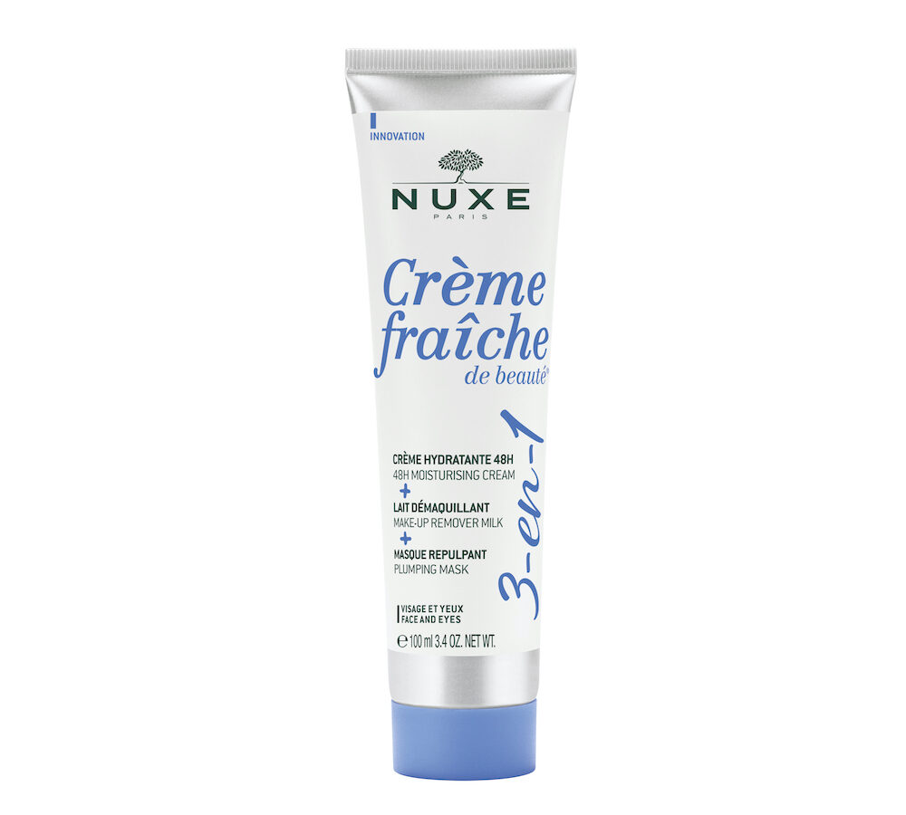 NUXE CRÈME FRAÎCHE DE BEAUTÉ 3 in 1 – È la prima routine all-in-one Nuxe, un solo prodotto che, a seconda della quantità e del metodo di applicazione, può essere utilizzato come crema idratante, latte detergente o maschera rimpolpante. Con latte vegetale, olio di mandorle dolci e burro di karité, è adatto anche per il contorno occhi.