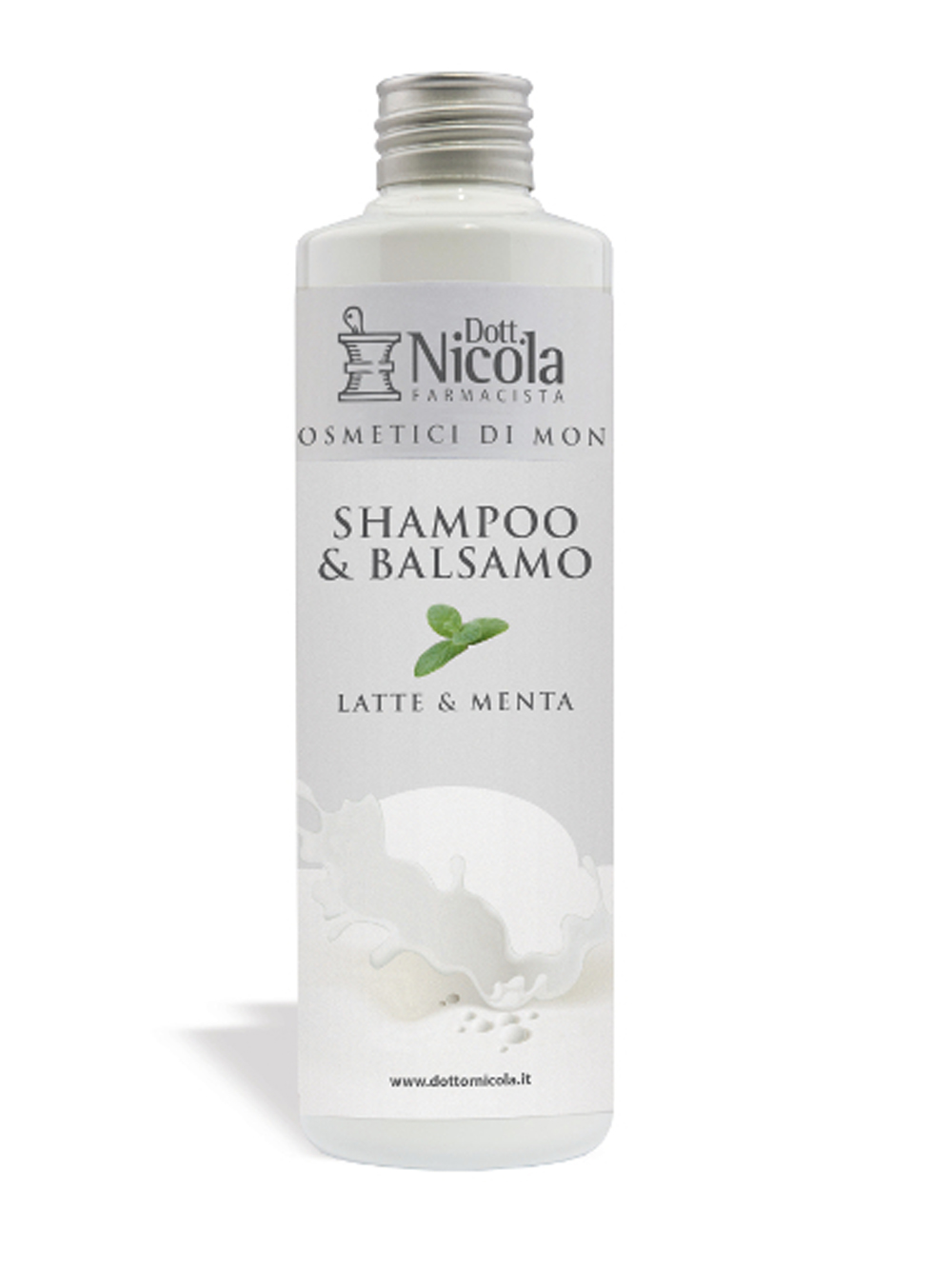 Shampoo e balsamo al latte e menta del marchio Fitocosmetici di montagna Dottor Nicola.