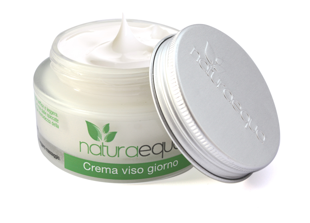 Crema viso da giorno Naturaequa, con olio dell’olio d’oliva, olio di Argan e vitamina E, un mix dalle spiccate proprietà idratanti e protettive.