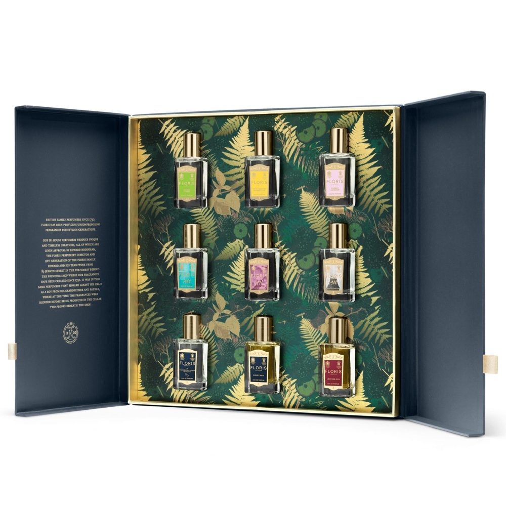 Un vero e proprio guardaroba che si apre su una raccolta in edizione mignon delle interpretazioni profumiere del marchio Floris. Sullo sfondo di una stampa natalizia, i flaconi dei profumi si dividono tra nuove creazioni e grandi classici.
