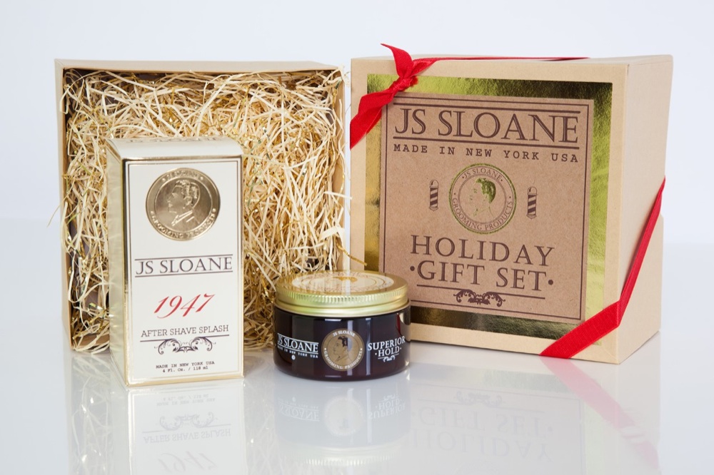 Stile anni ’50 per il coffret di JS Sloane con all’interno la Superior Hold per una chioma perfettamente ordinata durante le feste e 1947 After Shave Splash da usare in abbondanza.