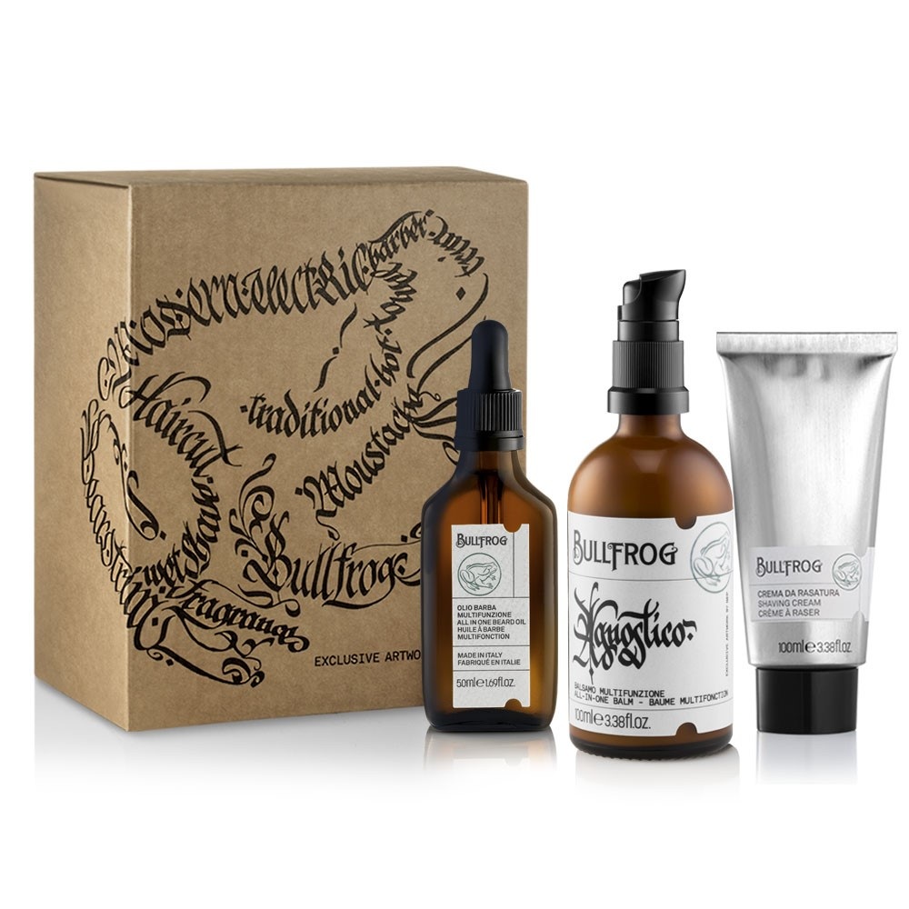 Per l’occasione, Bullfrog ha chiesto all’artista Giuseppe Caserta, in arte Gep, di decorare le box con il suo tipico tattoo gotico, linee pulite e tratto morbido. All’interno il balsamo Agnostico, best-seller multifunzionale del marchio, l’olio barba e la crema da rasatura.