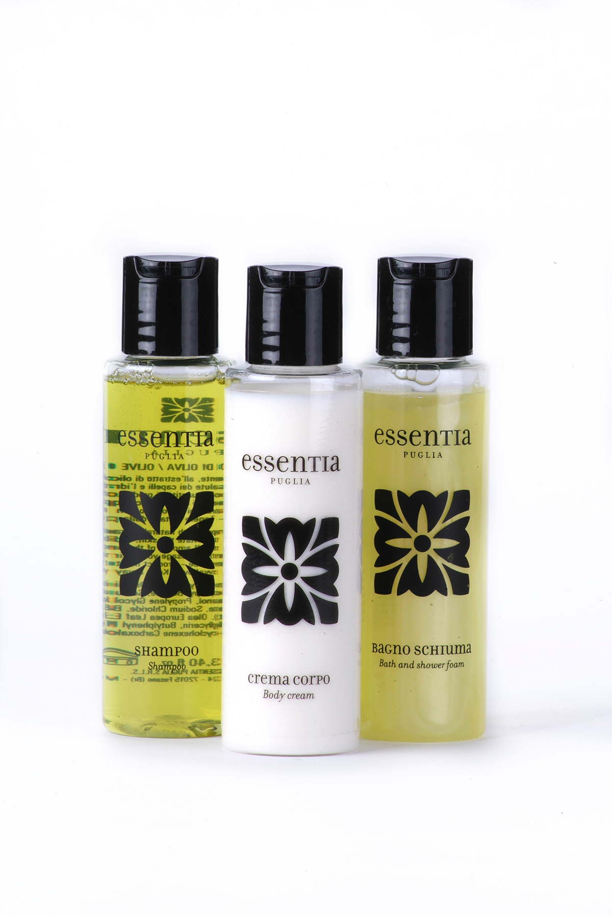 La collezione. Essentia Puglia comprende crema corpo, bagno schiuma, shampoo e sapone liquido all’olio di oliva e uva, sia in formati standard, che da viaggio.