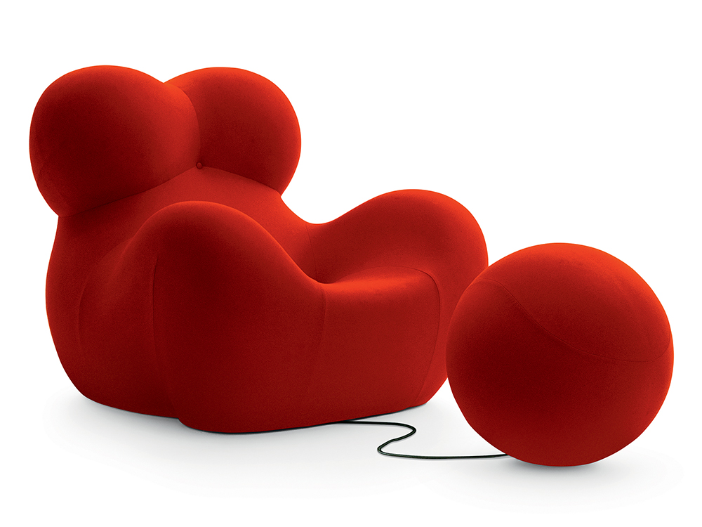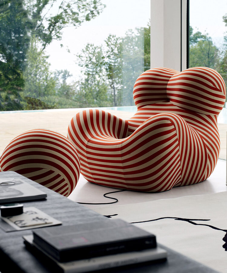 È in un’Italia segnata della rivolta studentesca e operaia e, nel campo della progettazione, dall’avvio di esperienze destinate a fare storia, come le ricerche dei gruppi Archizoom e Superstudio, che lo scultore, designer e architetto Gaetano Pesce disegna uno dei prodotti più rilevanti della sua lunga carriera. Ribattezza Mama e Donna, la poltrona ufficialmente denominata UP5_6, prodotta fin dal 1969 da B&B Italia, evoca dichiaratamente con le proprie forme sinuose il corpo femminile e rivela tutta la complessità dell’essere donna. ‘In quel momento io raccontavo una storia personale su quello che è il mio concetto sulla donna: la donna è sempre stata, suo malgrado, prigioniera di sé’, ha dichiarato Pesce. ‘Così mi è piaciuto dare a questa poltrona una forma di donna con la palla al piede, che costituisce anche l’immagine tradizionale del prigioniero‘. Rieditata nel 2000 e presentata in occasione del recente cinquantenario nelle versioni in tinta unita rosso aranciato, blu navy, verde smeraldo, verde petrolio e cardamomo, oltre che con righe beige/verde petrolio secondo la palette del ’69, la poltrona è parte delle collezioni di design permanenti della Triennale di Milano, del MoMA di New York, del Vitra Design Museum e del Musée des Beaux-Arts di Montréal.