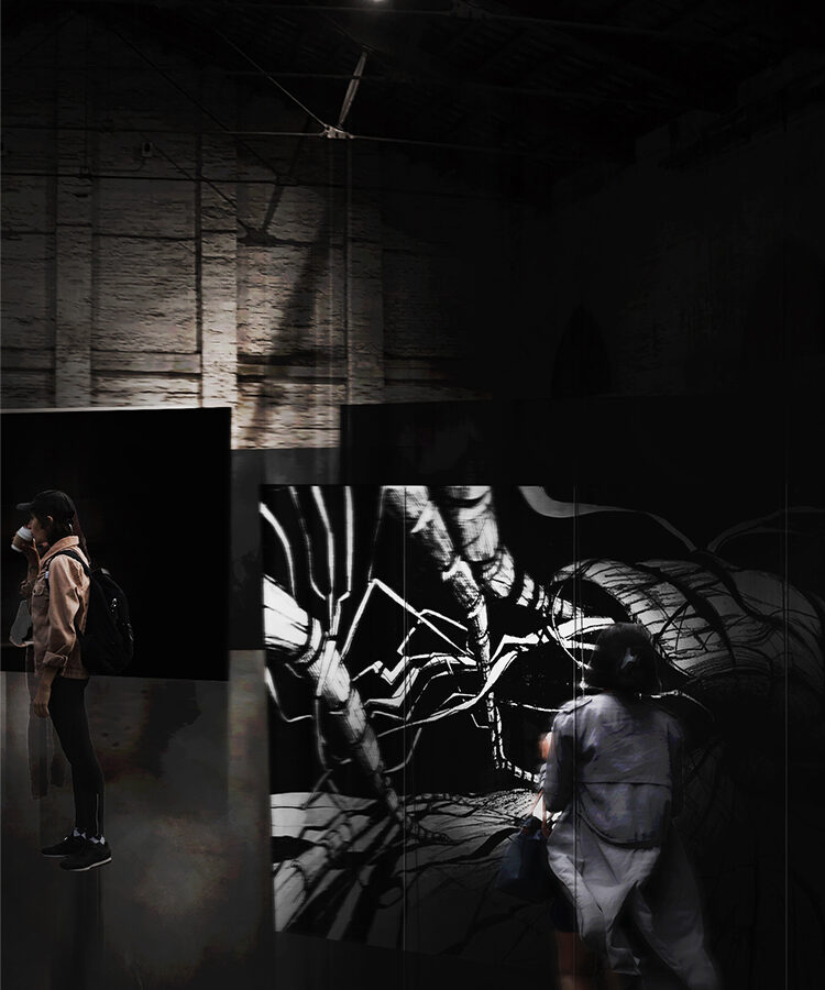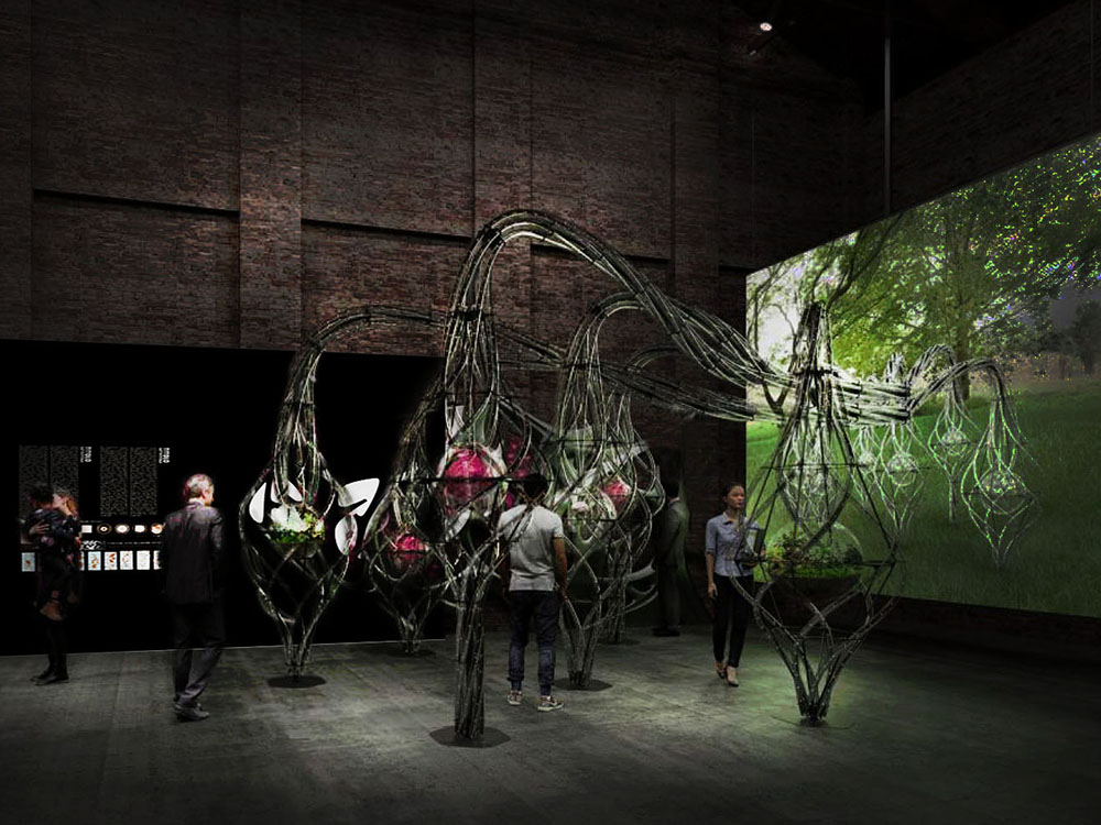 Tra gli anni Sessanta e i Duemila alcuni biologi hanno inteso sfidare ed estendere la tassonomia tradizionale sull’adattamento evidenziando che, in natura, esistono strutture senza funzioni e in grado di acquisire nuove funzioni. Queste strutture, si chiamano ‘spandrel’ e costituiscono un serbatoio di resilienza (cioè di possibilità) indispensabile quando le condizioni ambientali mutano rapidamente ed imprevedibilmente. Abbiamo quindi trattato le strutture della precedente mostra come ‘spandrel’. Ogni installazione, lungo il percorso, è progettata per rispondere ad un determinato programma funzionale, e, allo stesso tempo, e le sue forme (come in biologia gli organismi) devono essere caratterizzate da diversità, variabilità e ridondanza tali, da consentire l’adattamento a condizioni ambientali imprevedibili. L’installazione che si chiama Spandrel, per esempio, era inizialmente pensata come un albero artificiale che prendeva in prestito, per il tronco, la coda xenomorfica di Alien. Le sfere che simulavano le sue uova, grazie al controllo dell’umidità e della luce, al loro interno, sono poi diventate una banca del seme di specie alimentari che provengono dalla collezione dell’Orto Botanico di Padova, il più antico del mondo.