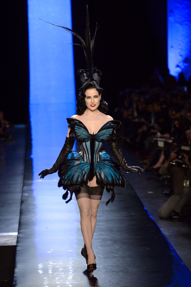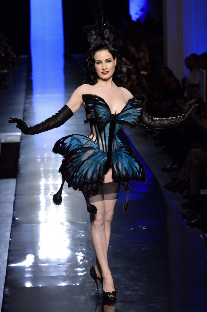 A Dita spetta il compito di chiudere la sfilata, in nome della sensualità. Lei è stata chiamata a interpretare al meglio il ruolo di una butterfly ammiccante e contemporanea nello spirito del pensiero di Gaultier: ‘La vita è una farfalla’. Stretta in un corsetto dai colori della notte, con piume, paillettes e ali da farfalla, ha percorso la passerella per essere poi raggiunta da Jean Paul in persona: finale al bacio.