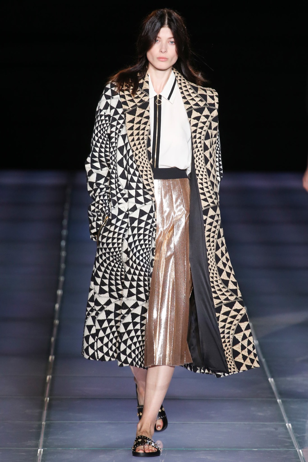 Bianca sì, ma dal twist rock, è invece quella di Fausto Puglisi: perfetta nelle proporzioni, virginale, dal colletto inamidato, in cotone stretch, trova la sua perfetta dimensione su gonne plissettate dai bagliori dorati e cappotti dai motivi geometrici, mentre ai bottoni si sostituisce una più dinamica zip.