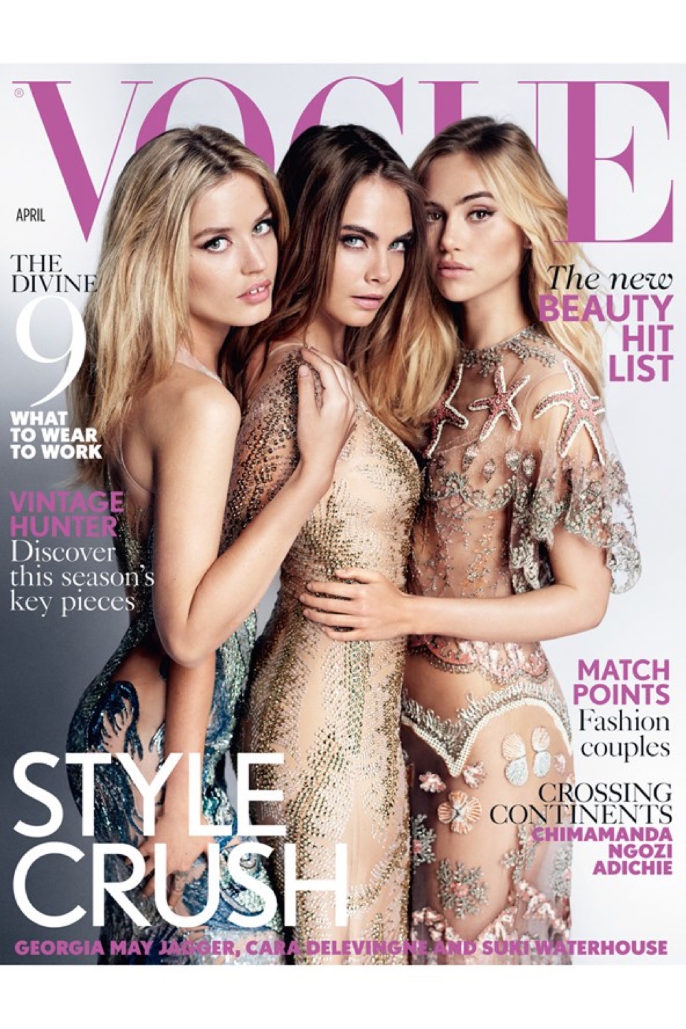 La vera battaglia del mese è però tra le modelle: se Catherine Mc Neill ammicca dalla copertina di Vogue Messico, con l’espressione di chi è sicura del fatto suo, Vogue Uk mette in campo un trio d’assi, it-girl, modelle e aspiranti attrici tra le più amate dal mondo della moda, come la presenzialista Cara Delevingne, la figlia d’arte e modella Georgia May Jagger e Suki Waterhouse, appena tornata libera di dedicarsi alla sua carriera di attrice dopo la fine del rapporto con Bradley Cooper.