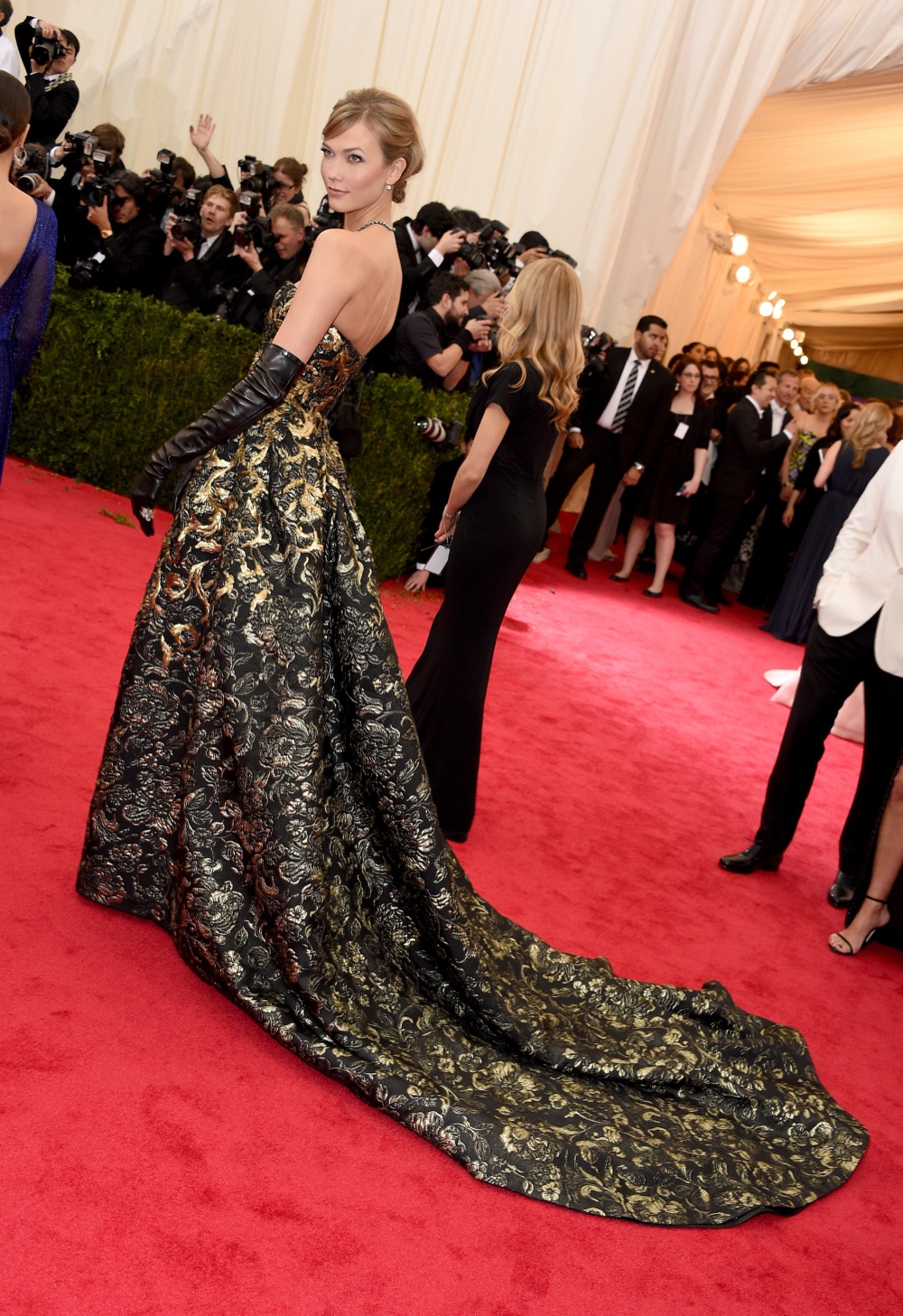 Karlie Kloss in un abito damascato, nero e oro (Getty Images)