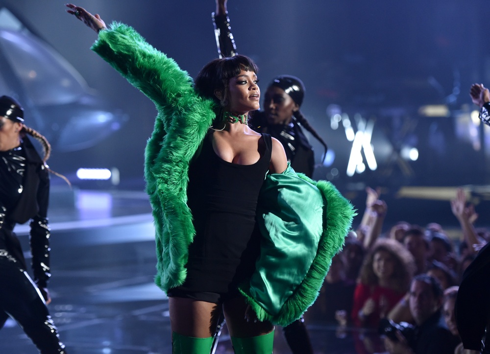 Pubblicato su Dubsmash, è seguita solo un giorno dopo un’esibizione a sorpresa agli iHeart Music Radio Awards, dove Riri, nominata da poco nuova testimonial Dior, si è esibita nel pezzo dal titolo che non va troppo per il sottile ‘Bitch better have my money‘, con cuissardes verdi in vinile, e pelliccia ton sur ton. Aria decisa e occhiali a mascherare il volto, la cantante ha mandato in delirio la folla.