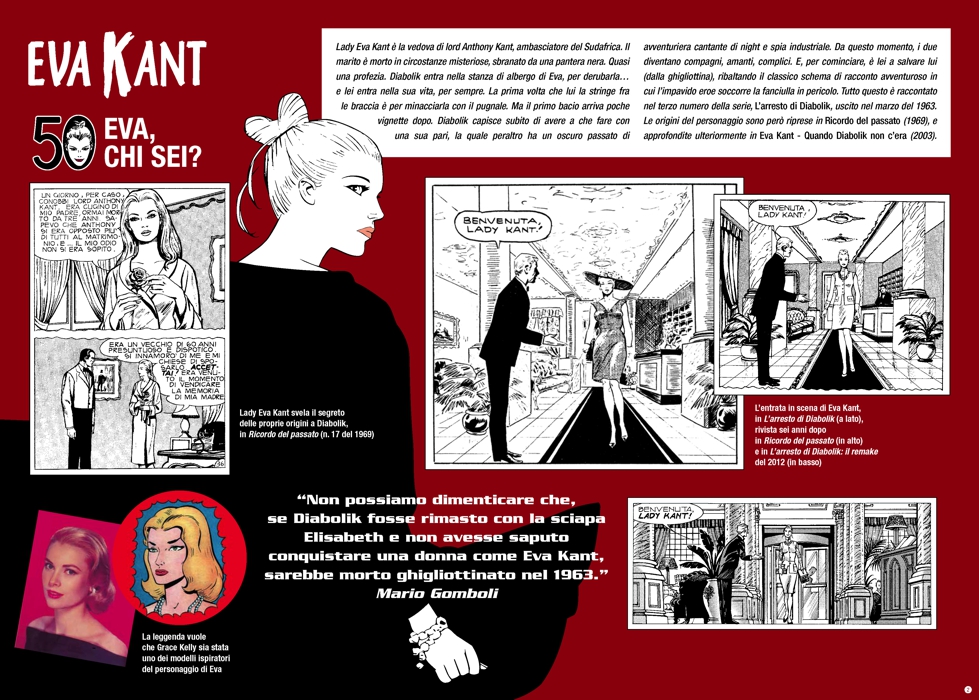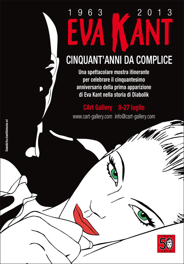 Al suo primo incontro con Diabolik dichiara subito, con un pizzico di orgoglio, di essere una donna pericolosa, con un passato da avventuriera e da spia. Fredda e determinata, Eva Kant è anche bellissima, bionda, occhi verdi profondi. Siamo nel marzo 1963 e con l’episodio L’arresto di Diabolik nasce uno dei personaggi femminili più affascinanti e intriganti nel mondo del fumetto. Non solo: Eva Kant è un’icona a tutto tondo e non stupisce che oggi, dopo 50 anni, sia ancora saldamente presente nell’immaginario maschile e susciti ammirazione nel pubblico femminile.