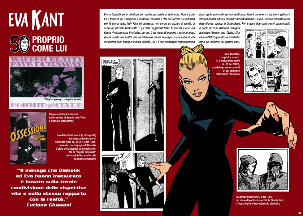 Per capire il motivo di tanto successo bisogna tornare agli anni del suo esordio. A quei tempi le figure femminili (non solo del fumetto) erano rappresentate come povere svampite, capaci solo di ficcarsi nei guai per dare la possibilità all’eroe di turno di soccorrerle e dimostrare la propria virilità. Eva è tutt’altra cosa: è lei a salvare Diabolik dalla ghigliottina e a farlo innamorare. Insomma, i ruoli sono capovolti e la signora Kant appare subito come una donna dal passato ombroso. Tanto che si sospetta sia la diretta responsabile della morte del ricco marito, l’ambasciatore del Sudafrica Lord Anthony Kant, sbranato da una pantera durante una battuta di caccia.