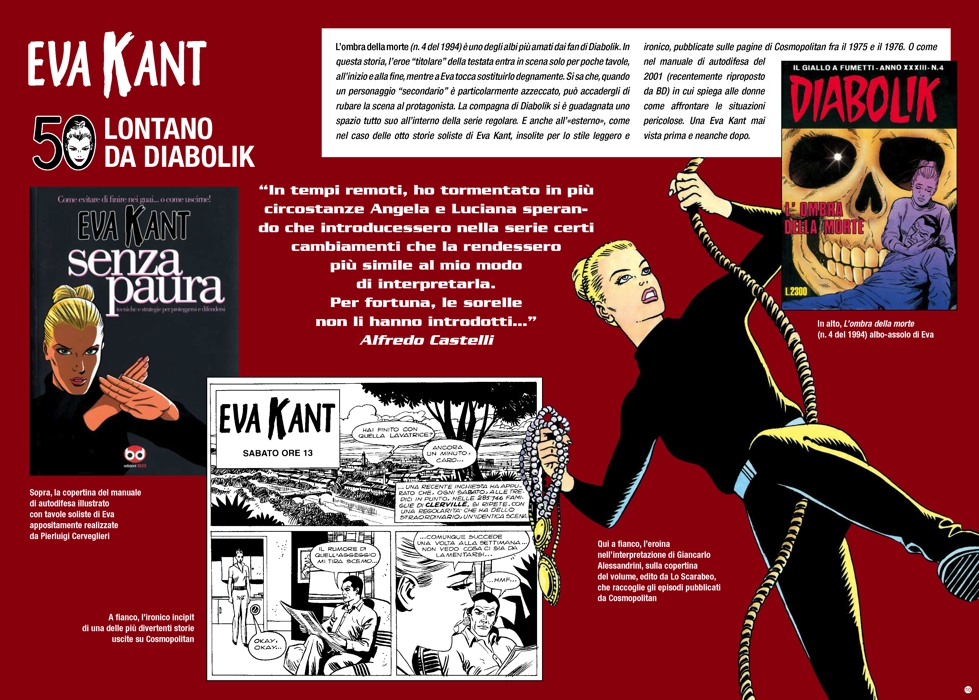 Chi poteva ideare un personaggio tanto diverso dai cliché delle eroine del tempo, scapestrato e al tempo stesso estremamente sensuale? Una donna, naturalmente. Anticonformista e dotata della stessa intraprendenza, Angela Giussani (in un secondo tempo affiancata nella stesura delle storie dalla sorella Luciana) la creò a sua immagine e somiglianza. Angela era una bella signora della borghesia milanese, intelligente, ironica e ribelle. Nata nel 1922, viveva in un momento storico in cui le donne stavano all’ombra dei mariti, accudivano la prole e non avevano grandi velleità di emancipazione. Lei invece era pilota d’aereo, guidava l’auto, praticava tutti gli sport allora considerati prettamente maschili, come l’equitazione e lo sci. E faceva la modella per la moda e la pubblicità (ve la ricordate con il sapone Lux?). Eva Kant (a proposito, Kant come il filosofo tedesco, forse a sottolineare che non si tratta di una stupida bionda) le assomiglia anche nel ruolo di moglie/amante: sposata all’editore Gino Sansoni, uomo brillante e dinamico, Angela lo ammirava e assecondava in tutto, con discrezione ma senza rimanere nell’ombra. Proprio come Eva con il suo Diabolik.
