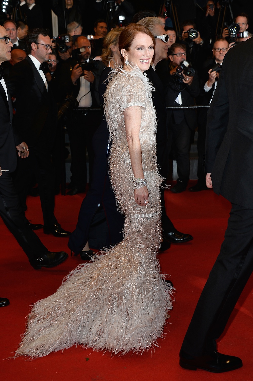 Anche se non presente alla serata di premiazione, la Moore durante tutta la settimana si è distinta per il suo stile, raffinato ed elegante, mai eccessivo. Ha infatti sfoggiato un lungo abito Louis Vuitton per la prima di Mr. Turner e un altro in organza e lamè firmato Chanel per la prima del film di Cronenberg. Niente spacchi e scollature esagerate per un’attrice che da sempre professa la sua estraneità al ‘ritocco’ estetico, molto apprezzato da altre dive di Hollywood. La sua bellezza passa anche da una pelle volutamente diafana, quasi mai abbronzata ma brillante come una madreperla rara.