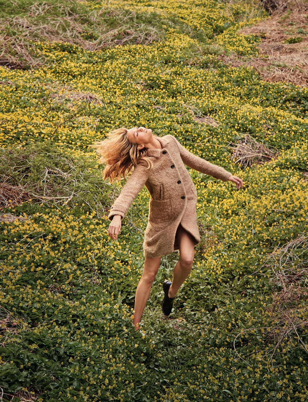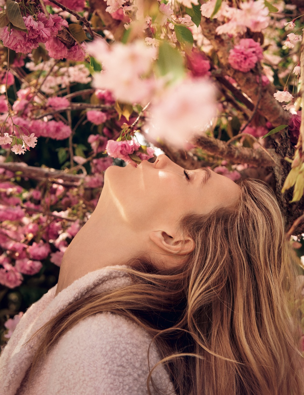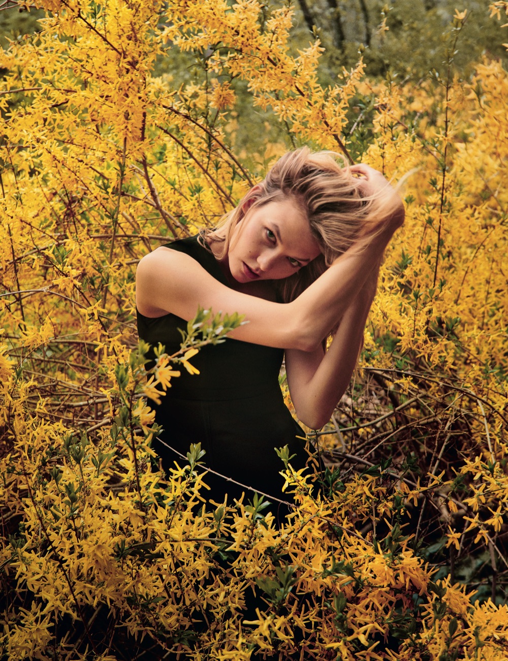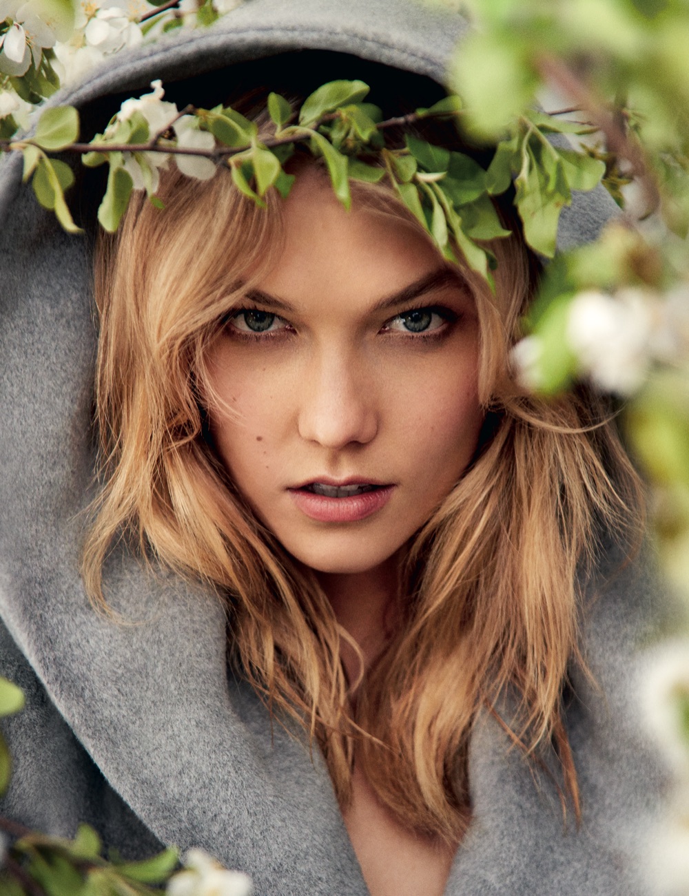 Attitudine romantica, capispalla avvolgenti e tinti in tonalità pastello, Karlie passeggia tra prati fioriti e i giardini all’inglese di Upstate New York.