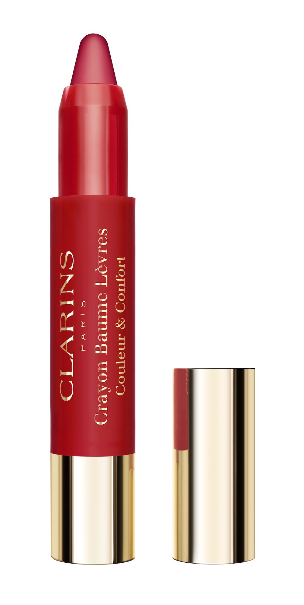 Crayon Baume Lèvres Sweet Cherry di Clarins ha la texture satinata, prprio comq il rossetto scelto da Angelina Jolie