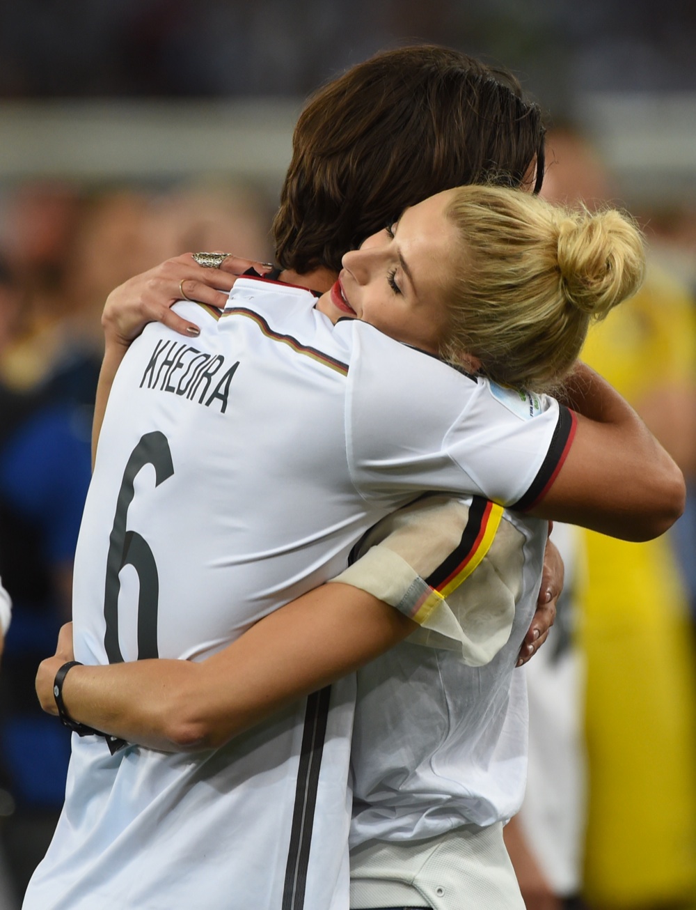 Germany’s midfielder Sami Khedira celebrates with his wife after winning the 2014 FIFA World Cup final football match between Germany and Argentina 1-0 following extra-time at the Maracana Stadium in Rio de Janeiro, Brazil, on July 13, 2014. AFP PHOTO / PATRIK STOLLARZ