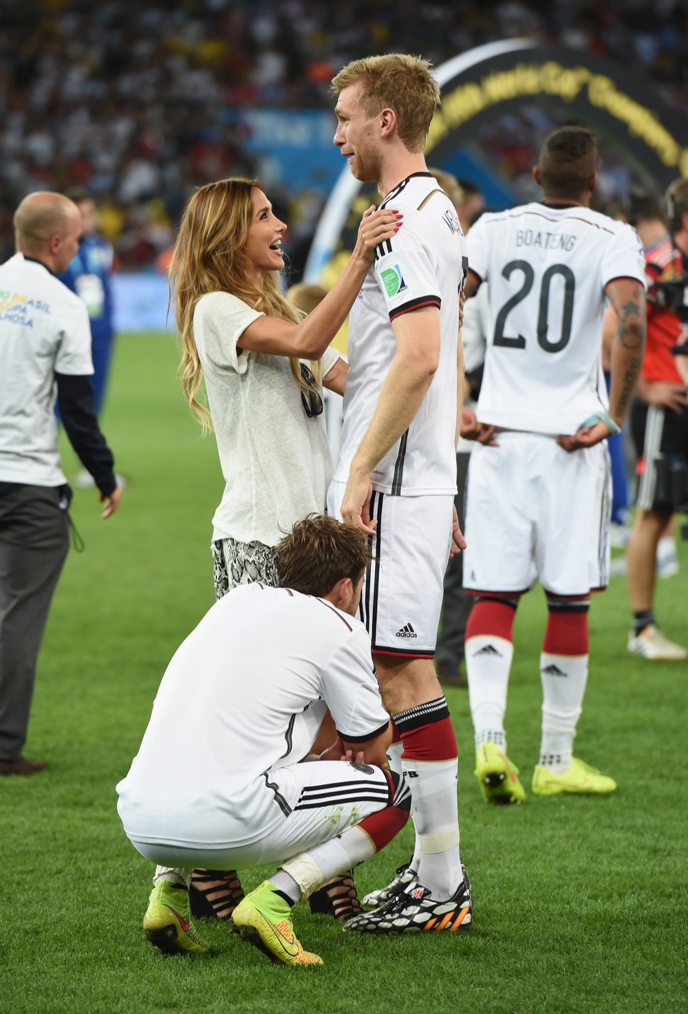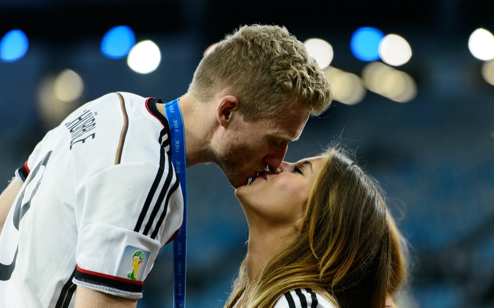RIO DE JANEIRO, BRAZIL – JULY 13: Andre Schuerrle of Germany celebrates with girlfriend Montana Yorke after defeating Argentina 1-0 in extra time during the 2014 FIFA World Cup Brazil Final match between Germany and Argentina at Maracana on July 13, 2014 in Rio de Janeiro, Brazil. (Photo by Matthias Hangst/Getty Images)