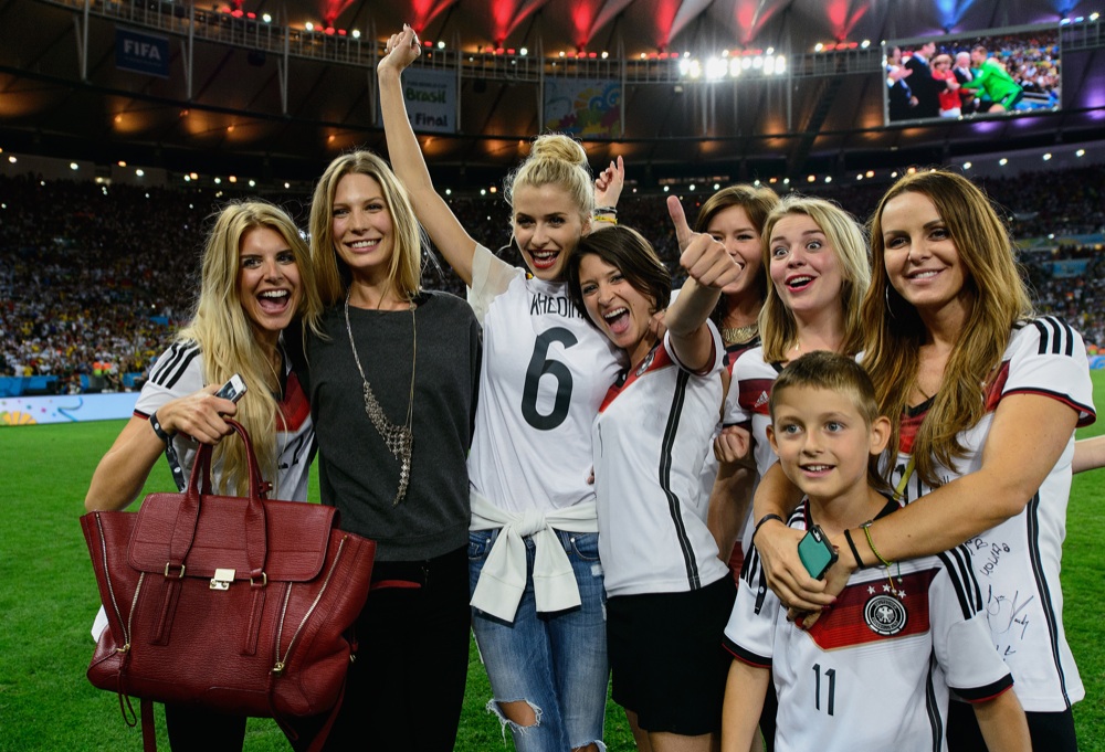 RIO DE JANEIRO, BRAZIL – JULY 13: (L-R) Lisa Rossenbach, Sarah Brandner, Lena Gercke, Kathrin Glich, Lisa Wesseler and Sylwia Klose celebrate after Germany defeat Argentina 1-0 in extra time during the 2014 FIFA World Cup Brazil Final match between Germany and Argentina at Maracana on July 13, 2014 in Rio de Janeiro, Brazil. (Photo by Matthias Hangst/Getty Images)