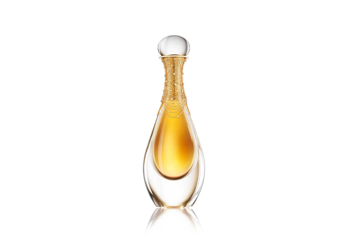 Sottili fili si alternano attorno al collo del sinuoso flacone di J’adore di Dior, diventano in pochi anni un classico della maison parigina.