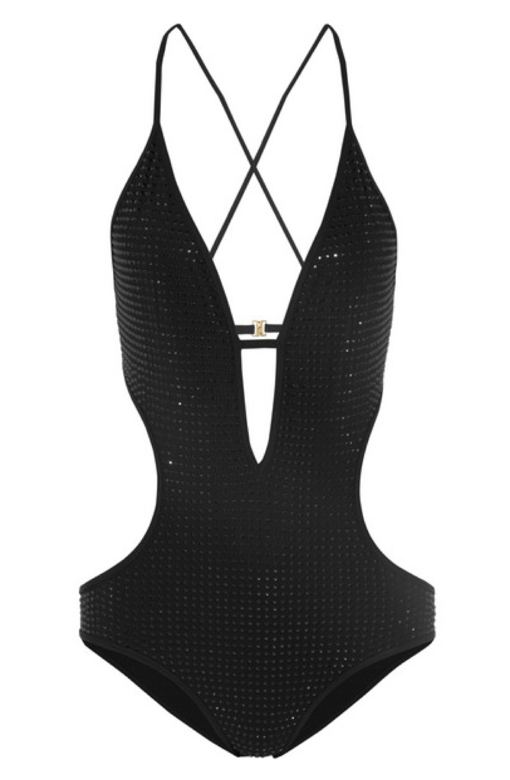 Intero ma sexy, il costume dallo scollo vertiginoso e micro-cristalli, ideale per un party in piscina a Miami, Gucci (credits: Net à porter)