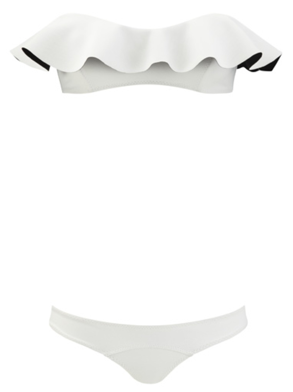 Con ruches sulla fascia, in bianco ottico, evoca il fascino delle divine francesi in vacanza a Biarritz, il bikini di Lisa Marie Fernandez