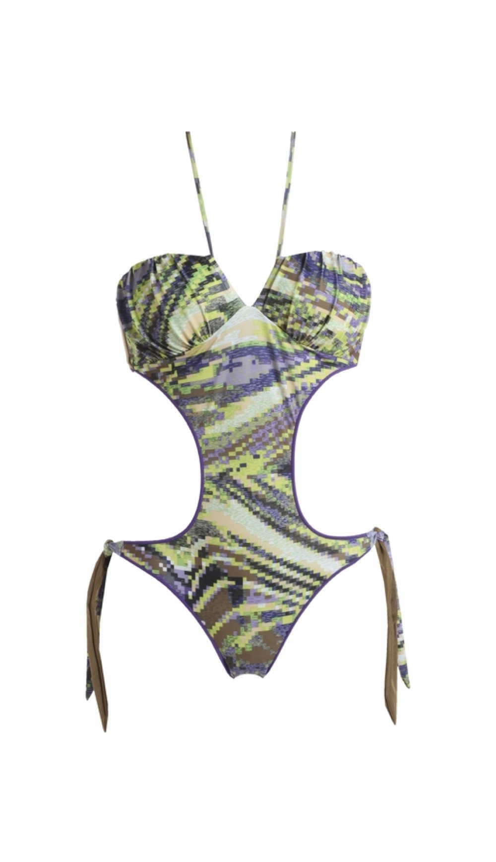 Un costume intero con oblò rivelatori e sensuali frange, con fantasia pixelata e i colori dei resort kenioti, Yamamay