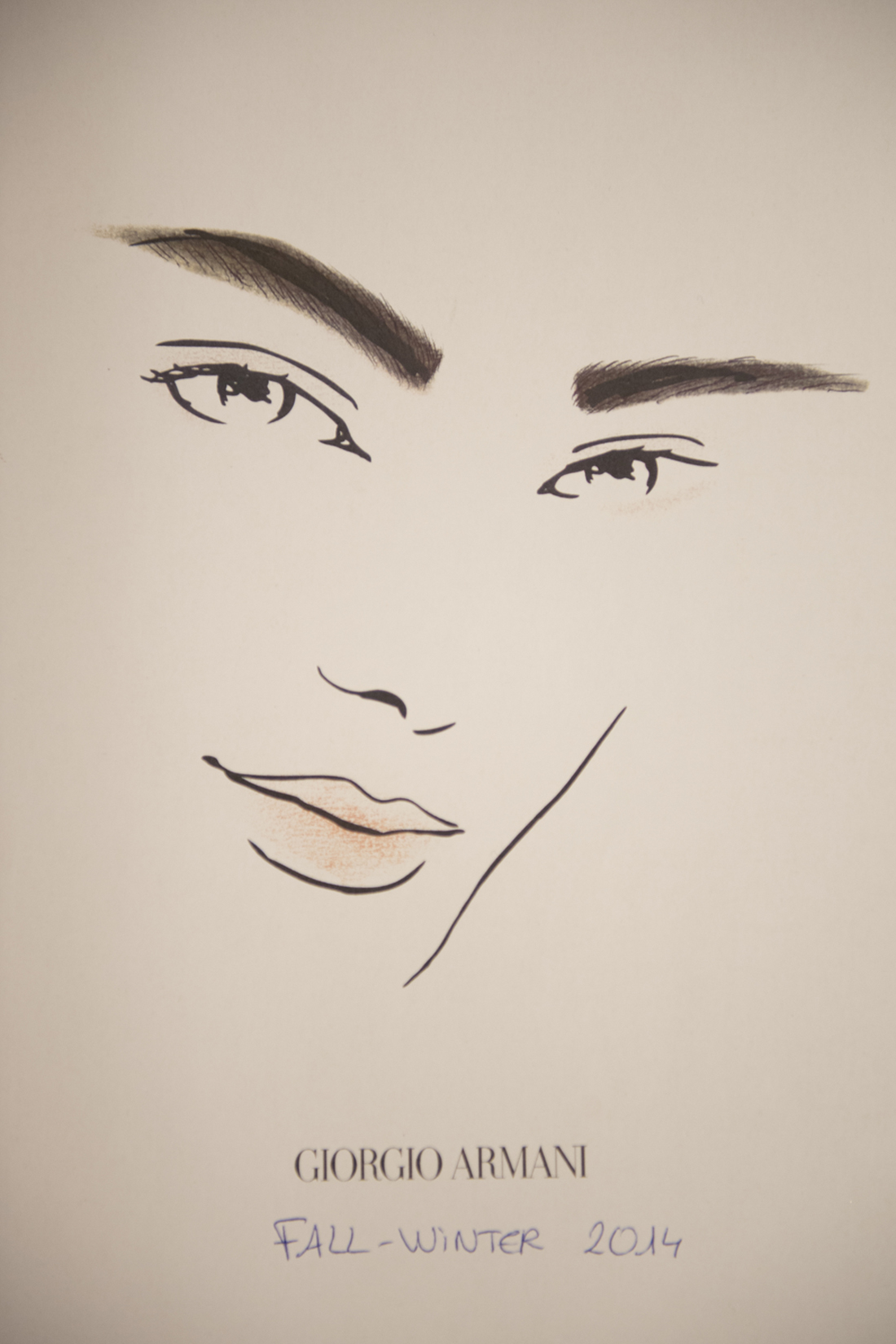 Il bozzetto di Linda Cantello per il look della sfilata autunno-inverno di Giorgio Armani: sopracciglia definite, il resto quasi nulla