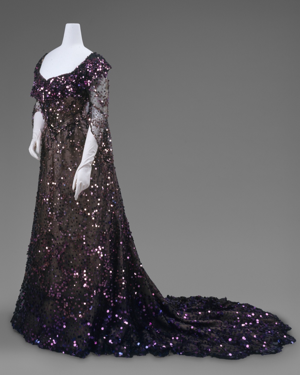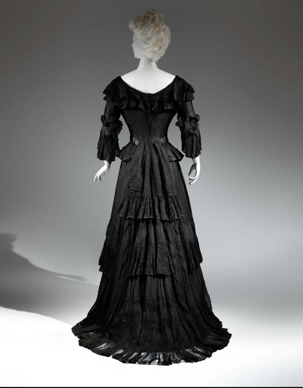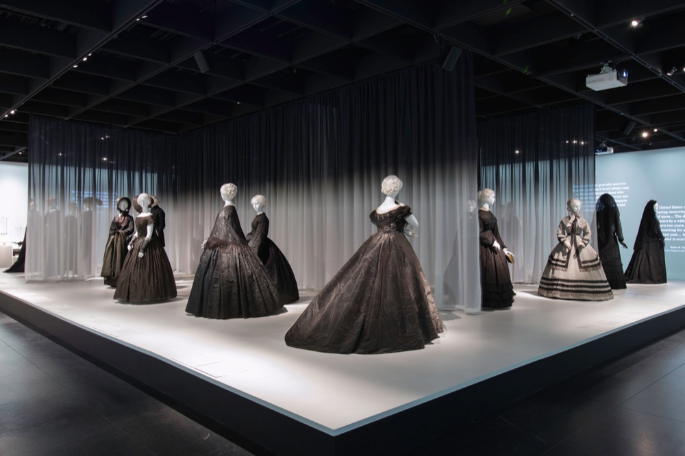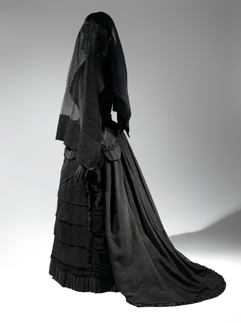 Una sola costante, quella del nero come cromia predominante, a colorare abiti sontuosi, che modificano sensibilmente la silhouette man mano che le decadi si susseguono. Si passa così dagli ampi vestiti con le scenografiche sottogonne rigide e i corsetti strizzati in vita del 1860 a volumi più morbidi, gonne scivolate (seppur sotto innumerevoli strati di taffetà e lavorazioni elaborate), corredate da ricami preziosi e scintillanti, che soddisfano con discrezione la vanità, anche durante il cordoglio. Un fenomeno di stile trasversale, che, nelle parole di Jessica Reagan, l’assistente del curatore Harold Koda ‘illustra come gli standard modaioli si siano sviluppati partendo dalle personalità di maggiore influenza, come ad esempio le regine (in mostra vi sono infatti anche gli abiti da lutto della Regina Vittoria e della Regina Alessandra, ndr) arrivando alle classi minori, attraverso le riviste di moda dell’epoca. Gli abiti erano poi già disponibili nei magazzini dedicati, che proliferavano nelle città americane ed europee del 1850‘. A completare la mostra, e a restituirci così l’intera storia del distinto fascino del lutto, accessori, foto d’epoca, e dagherrotipi.