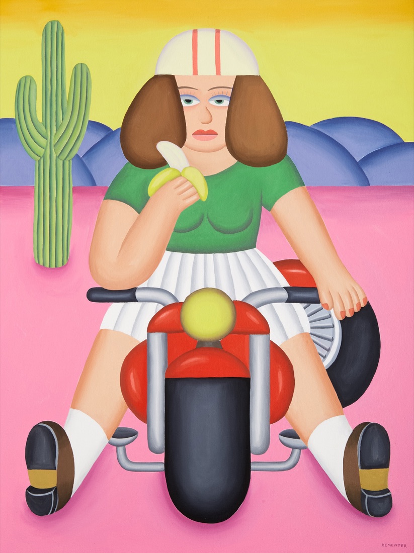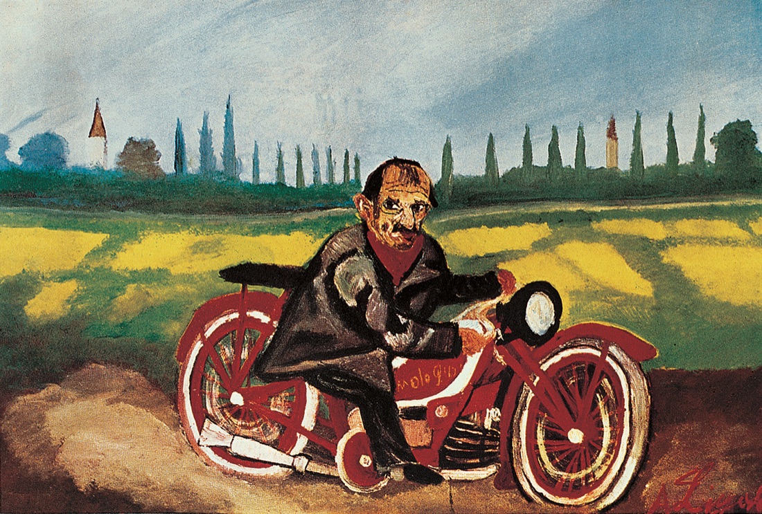 di Casey Stoner; la mitica Vespa di Bettinelli che ha percorso 24.000 km da Roma a Saigon, le special che hanno attraversato il deserto di sabbia della Parigi-Dakar, e ancora enduro, trial, nastri d’asfalto e, naturalmente, il mitico chopper di Easy Rider. Moto ad alto impatto evocativo, che si confrontano con opere di artisti come Antonio Ligabue (Autoritratto con moto del 1953), Mario Merz con Accelerazione = sogno, Pino Pascali con 9 mq di pozzanghere realizzati nel 1967, un anno prima della morte. E ancora: Alighiero Boetti, con le sue geniali Rosso Guzzi e Rosso Gilera (1971); la grande scultura Vejo di Giuliano Vangi (2010), le fotografie inedite di Gianni Piacentino High Speed Memories (1971-1976) che testimoniano la sua attività nelle corse in sidecar e i dipinti di Paul Simonon, ex bassista dei Clash, appassionato collezionista di moto. Il tutto lungo nove sezioni tematiche: Stile, forma e design italiano; Il Giappone e la tecnologia; Mal d’Africa; La velocità; Sì, viaggiare; London Calling; Il Mito americano; Terra, Fango e Libertà; La moto e il cinema.