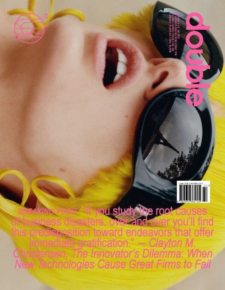 La parigina Double, fa di tutto per non sembrare la solita “rivista di moda che offre un punto di vista originale e trasversale sullo spirito dei nostri tempi.” Innanzitutto ha una doppia anima: un ampio portfolio di un artista-fotografo con un ruolo d’onore da un parte e testi scritti da famosi giornalisti dell’arte e del cinema dall’altra. L’aspetto visivo si intreccia a lunghe e accattivanti narrazioni. L’ultimo numero è all’insegna del ‘Breaking point’, con quattro diverse copertine da poter scegliere.